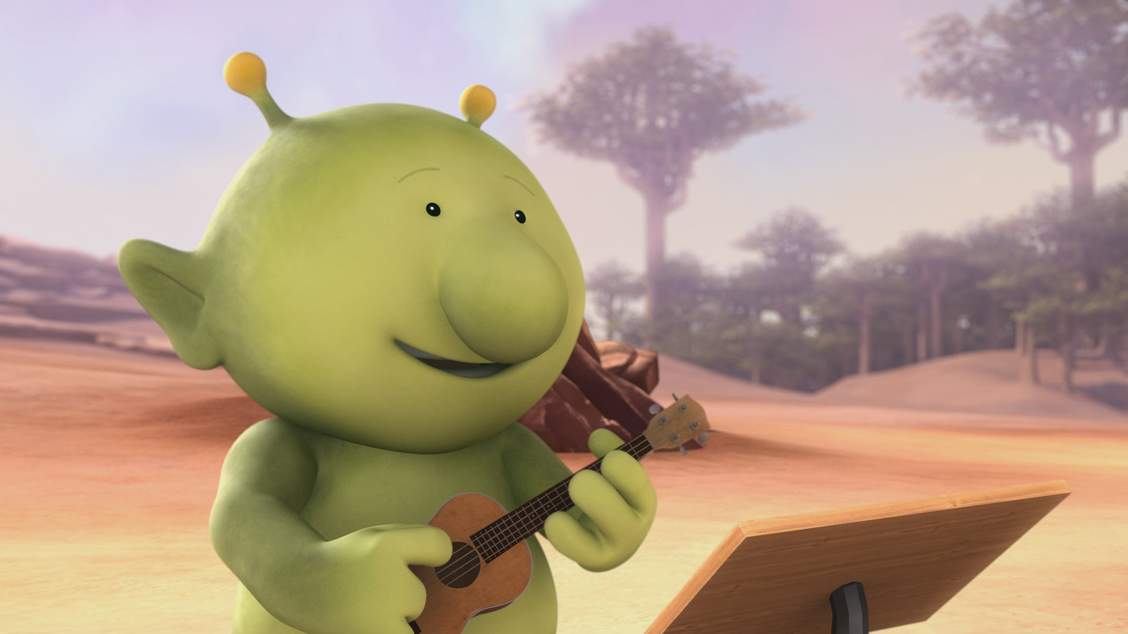 AffenhitzePootle haut bei der Orchesterprobe in die Saiten.Bild: © KiKA/Snapper Productions/Q Pootle 5 LTD