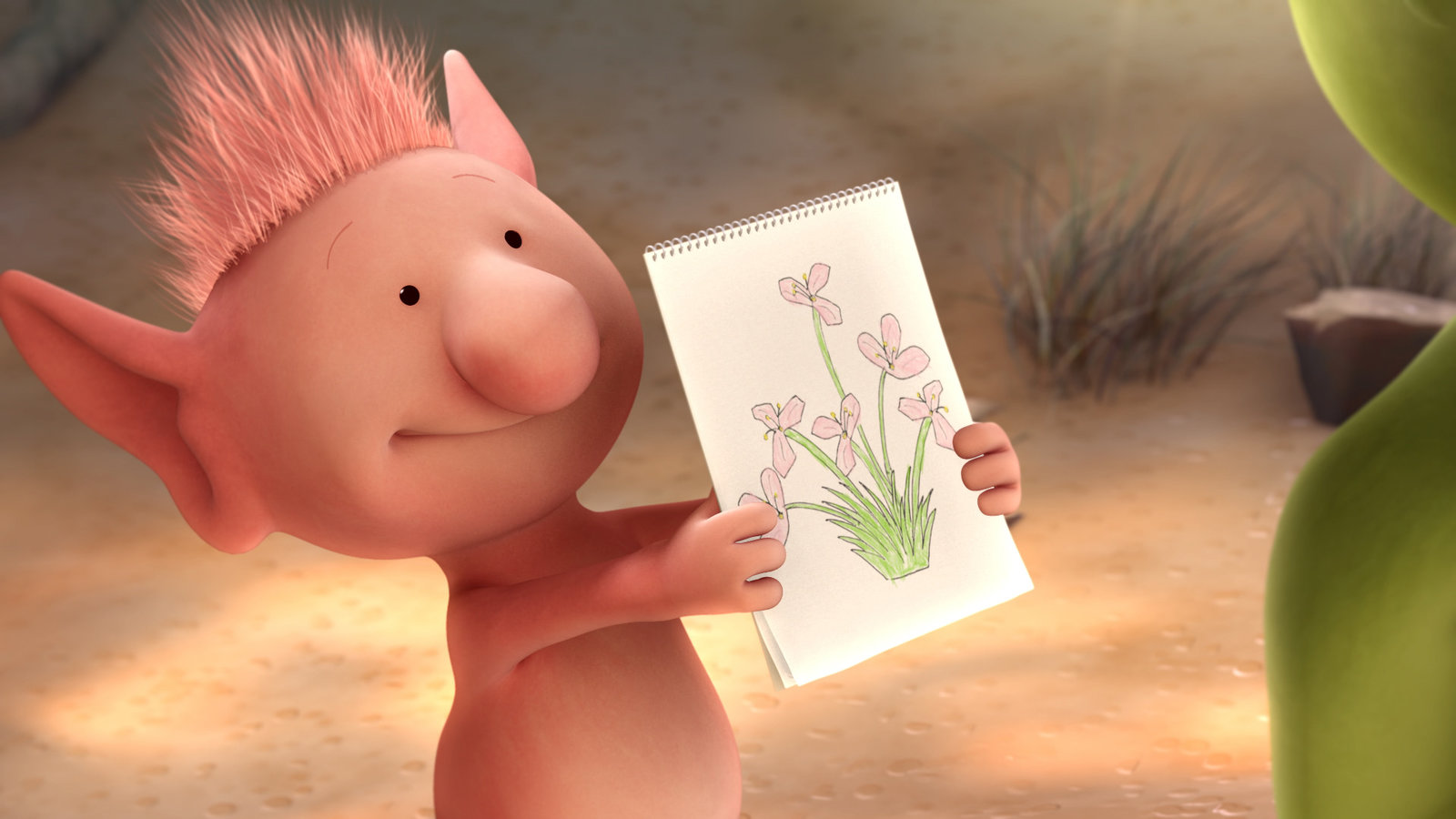 Auf ExpeditionOopsy zeigt ihren Freunden auf ihrem selbstgemalten Bild, was sie auf der Lichtung entdeckt hat.Bild: © KiKA/Snapper Productions/Q Pootle 5 LTD