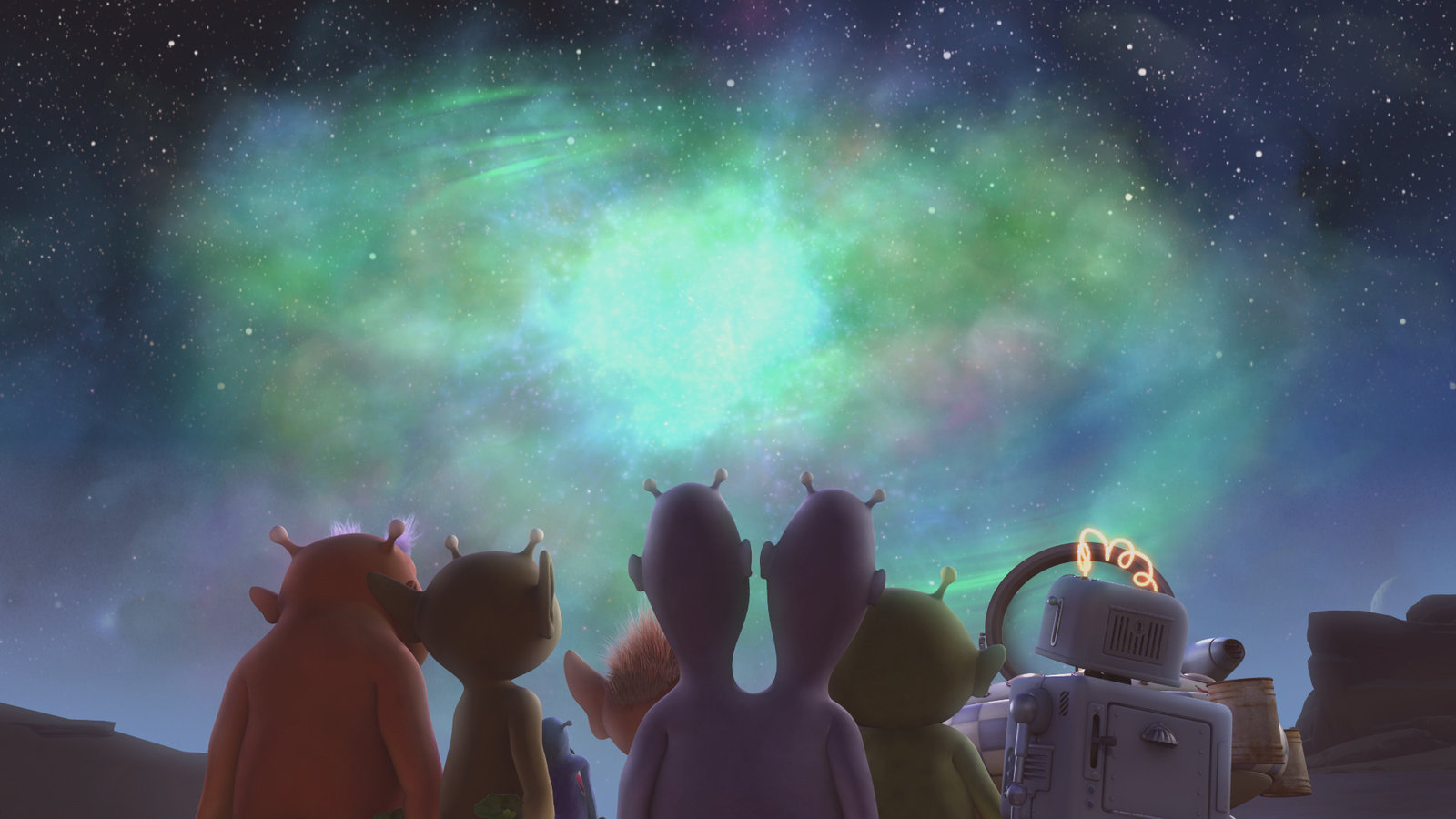 Kosmisches FlirrelnGemeinsam bewundern die Freunde das kosmische Flirreln, ein unglaubliches Lichtspektakel am Himmel von Okidoki.Bild: © KiKA/Snapper Productions/Q Pootle 5 LTD