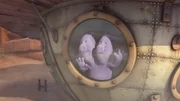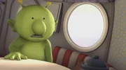 Groobie auf RettungsflugPootle beobachtet, wie Oopsy mit seinen Raketenschuhen durch die Luft fliegt.Bild: © KiKA/Snapper Productions/Q Pootle 5 LTD