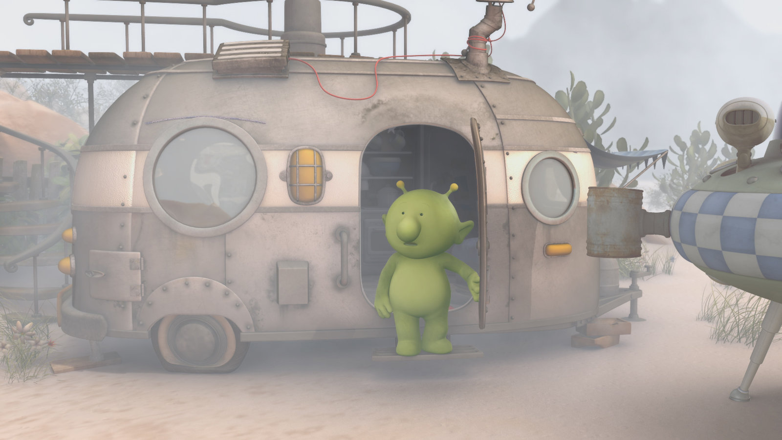 Ein Freund für KrahAls Pootle aus seinem Wohnwagen steigt liegt über ganz Okidoki ein dichter Nebelschleier.Bild: © KiKA/Snapper Productions/Q Pootle 5 LTD
