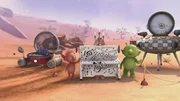 Planet Fred maltGroobies Selbstporträts und Bud-Ds Blechstatue werden bei der Ausstellung gemeinsam auf einem Raumschiff präsentiert.Bild: © KiKA/Snapper Productions/Q Pootle 5 LTD