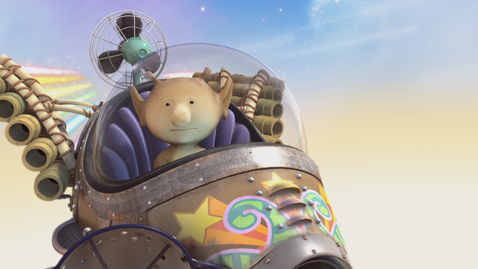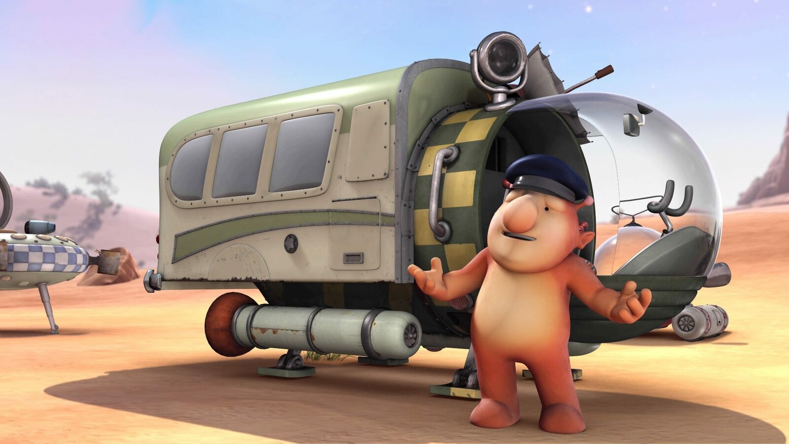 Raumschiff auf AbwegenGroobie hat sein Raumschiff zu einem fliegenden Reisebus umgebaut.Bild: © KiKA/Snapper Productions/Q Pootle 5 LTD