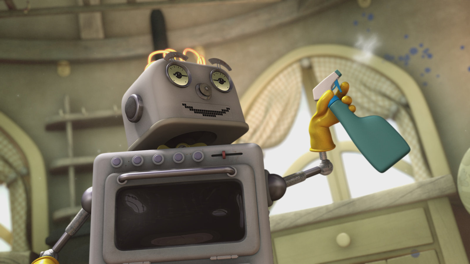 Der Groobie-WoogieOopsy hat bei den Renovierungsarbeiten an Stellas Haus Farbspritzer an der Wand hinterlassen. Bud-D hilft beim Putzen.Bild: © KiKA/Snapper Productions/Q Pootle 5 LTD
