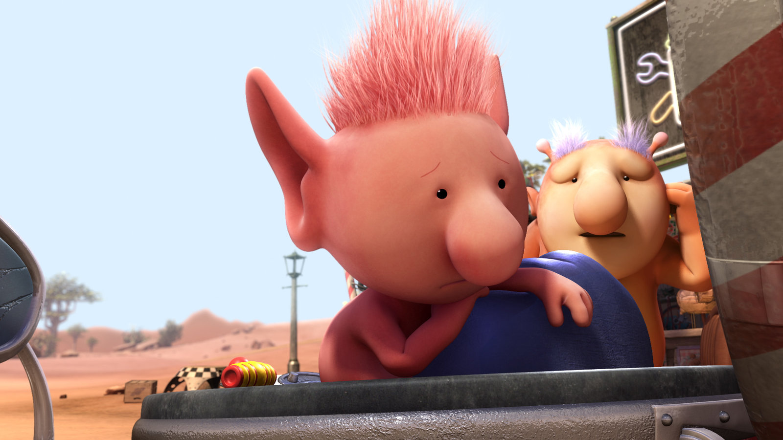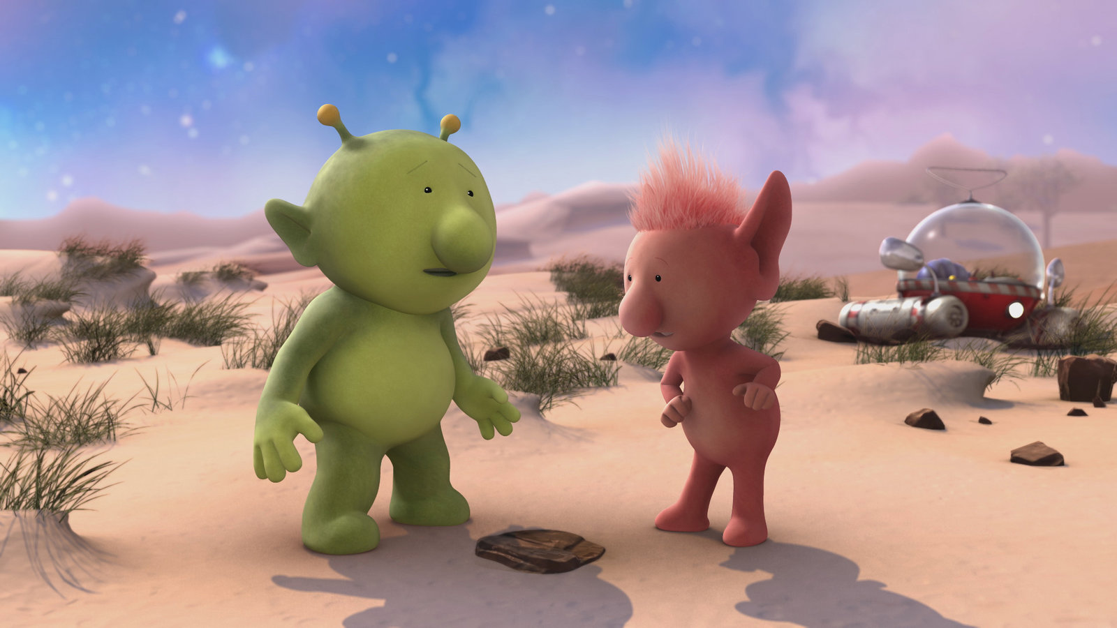 Auf ExpeditionOopsy (l.) wartet darauf, dass Pootle ihr Raumschiff wieder flott macht. Groobie (r.) meint, dass die Repatur seine Zeit braucht.Bild: © KiKA/Snapper Productions/Q Pootle 5 LTD