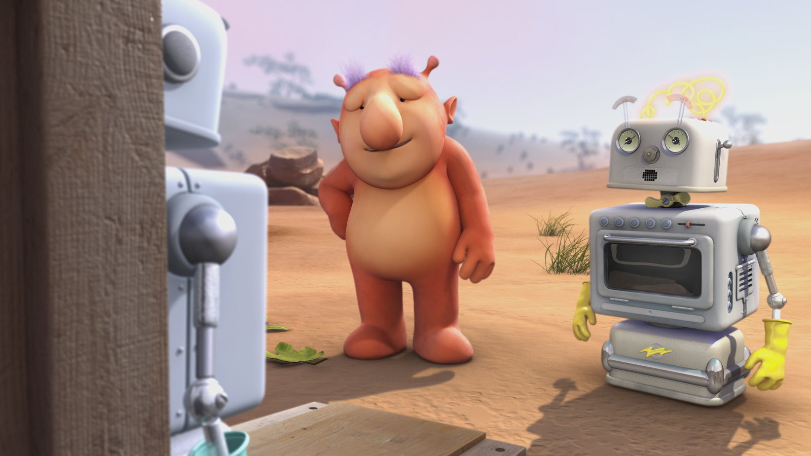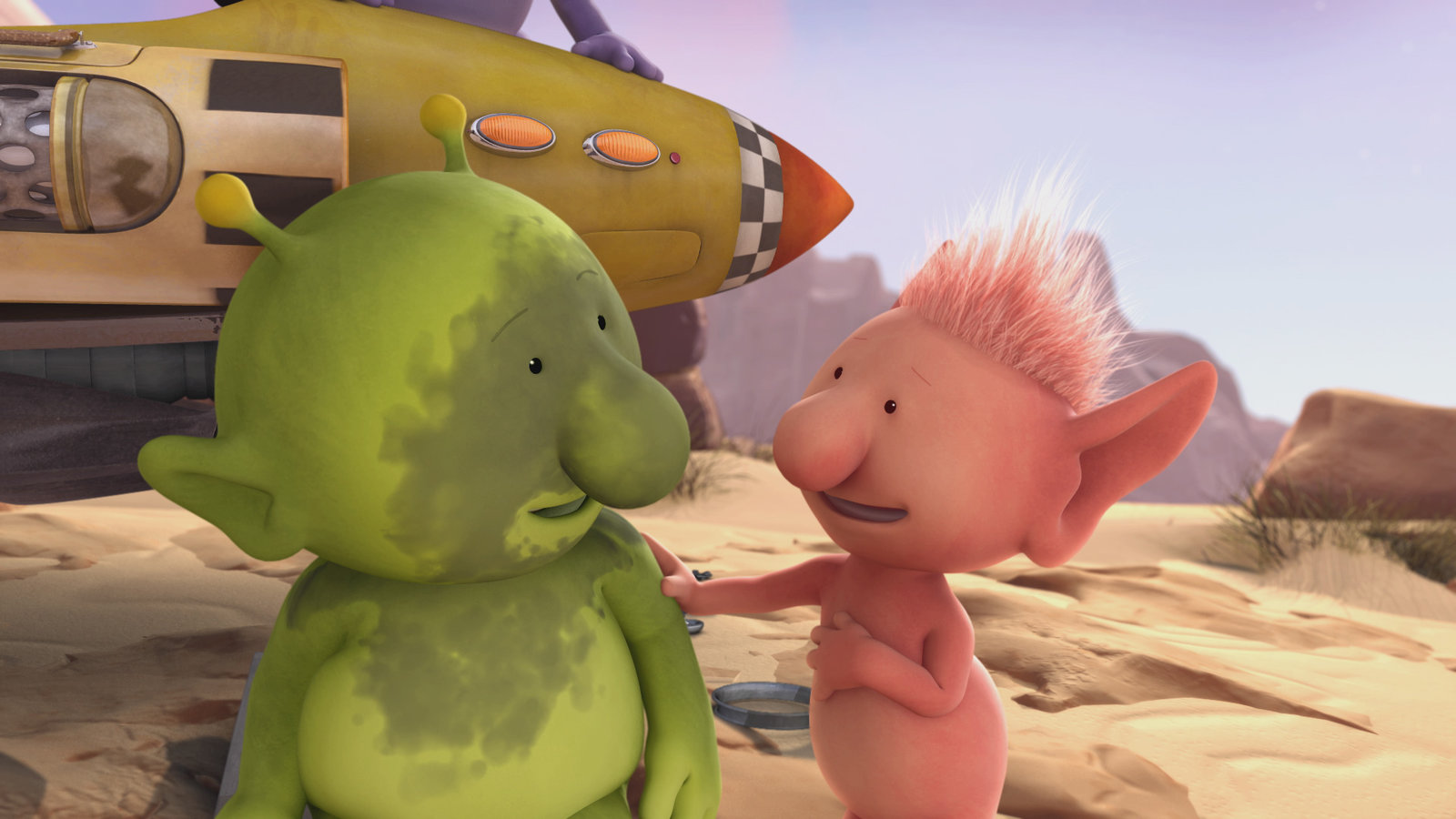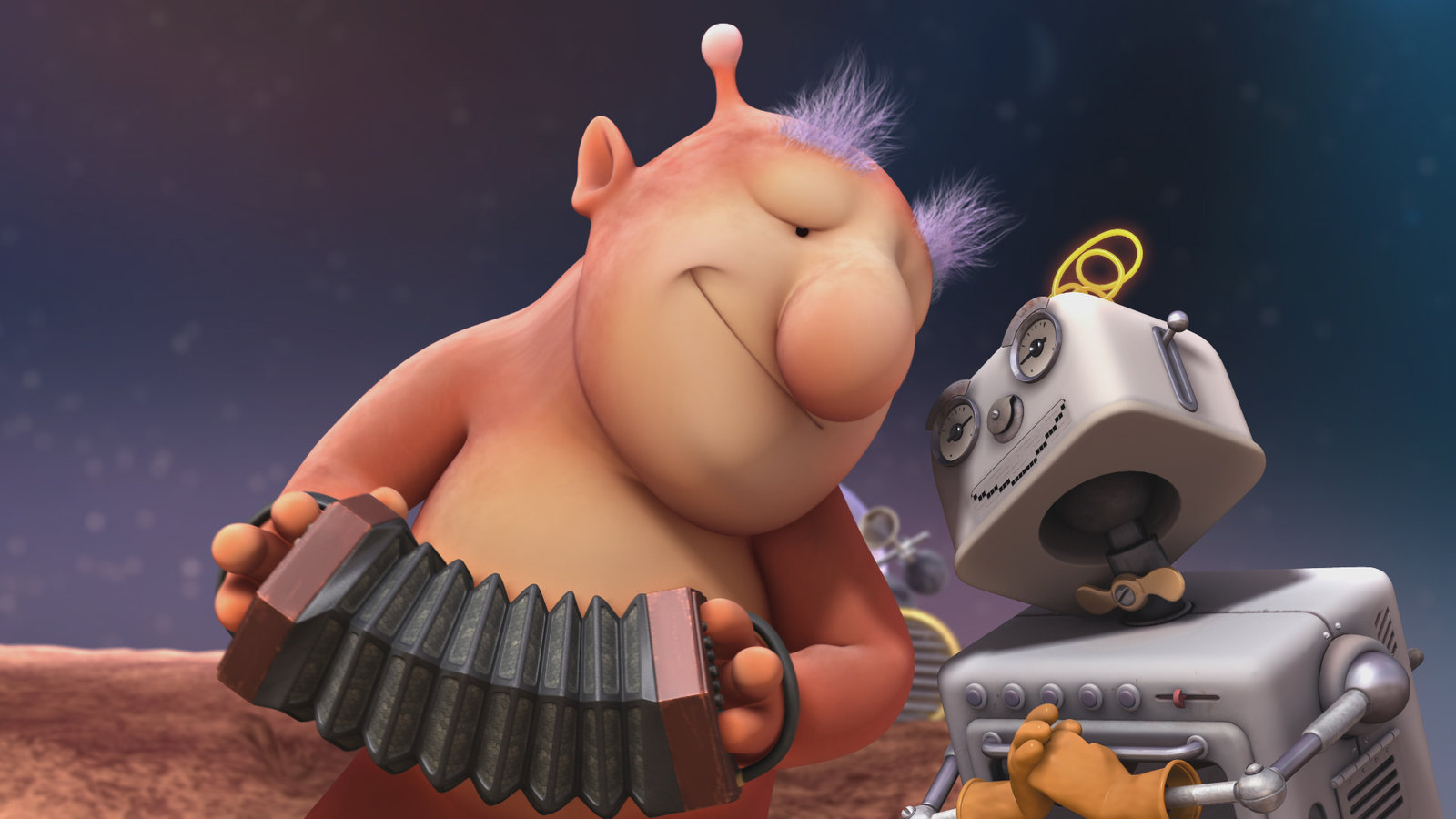 Wenn man sich zerteiltDie Freunde sind vor dem Asteroiden auf einen anderen Planeten geflüchtet und vertreiben sich dort die Zeit. Groobie und Bud-D musizieren.Bild: © KiKA/Snapper Productions/Q Pootle 5 LTD
