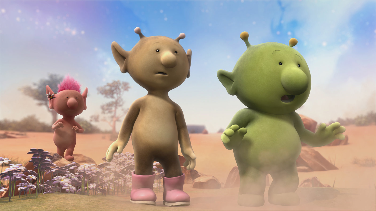 Wenn man sich zerteiltDie Freunde sind erleichtert, dass der Asteroid keinen Schaden auf Okidoki angerichtet hat.Bild: © KiKA/Snapper Productions/Q Pootle 5 LTD