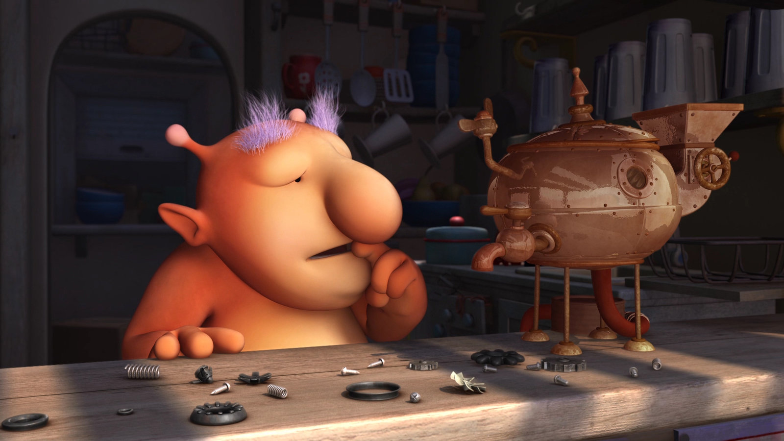 Gehüpft wie gesprungenGroobies Getränkemaschine ist kaputt. Er versucht sie zu reparieren und bestellt Ersatzteile.Bild: © KiKA/Snapper Productions/Q Pootle 5 LTD