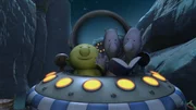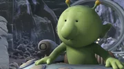Groobie auf RettungsflugGroobie hat mit seinem Raumschiff einen Unfall gebaut. Nach seiner Rettung möchte er sich am liebsten nie wieder hinters Steuer setzen.Bild: © KiKA/Snapper Productions/Q Pootle 5 LTD