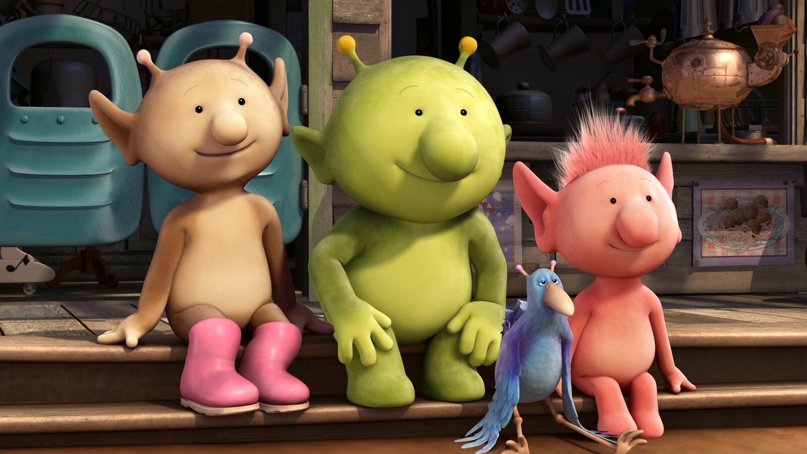 Ausflug mit GroobieStella, Pootle, Krah und Oopsy sitzen vor Groobies Haus.Bild: © KiKA/Snapper Productions/Q Pootle 5 LTD