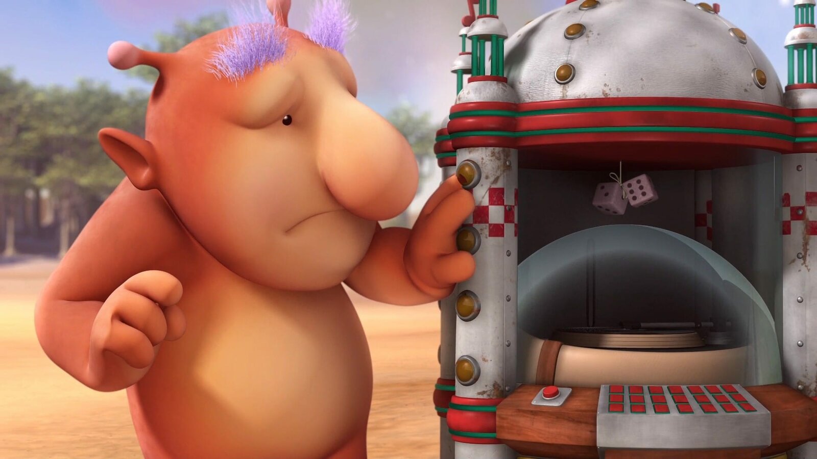 Bud-D rettet die TanzpartyGroobie hat eine Jukebox gefunden. Leider hat das Gerät schon ein paar Jahre auf dem Buckel und fällt ständig aus.Bild: © KiKA/Snapper Productions/Q Pootle 5 LTD