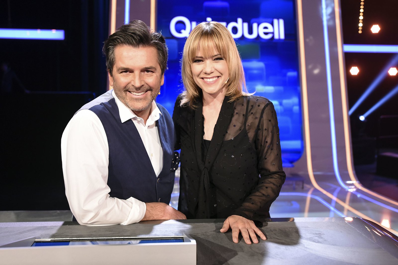 Olymp: Thomas Anders & Francine JordiBei Jörg Pilawa treten freitags um 18:50 Uhr Prominente zu einem außergewöhnlichen Duell an. Um zu gewinnen, müssen die Stars in sechs Runden drei superschlaue „Quizduell"-Profis schlagen. Ein Wissenswettkampf David gegen Goliath - die Stars gegen den „Quizduell-Olymp“. Es geht um Wissen und Nervenstärke, aber auch um die Einschätzung der Gegner und die Bereitschaft zu zocken. Und es geht um viel Geld. Doch Vorsicht! Im packenden Finale am Ende jeder Show heißt es für die siegreichen Kandidaten zunächst: doppelt oder halb. Eine spannende Wissensschlacht für Jung und Alt! Thomas Anders (l.) und Franci Jordi (r.) treten als Team „Musik“ gegen die Quizduell-Olympioniken Annika Schewe, Prof. Eckhard Freise und Thorsten Zirkel an.Bild: © ARD/Uwe Ernst
