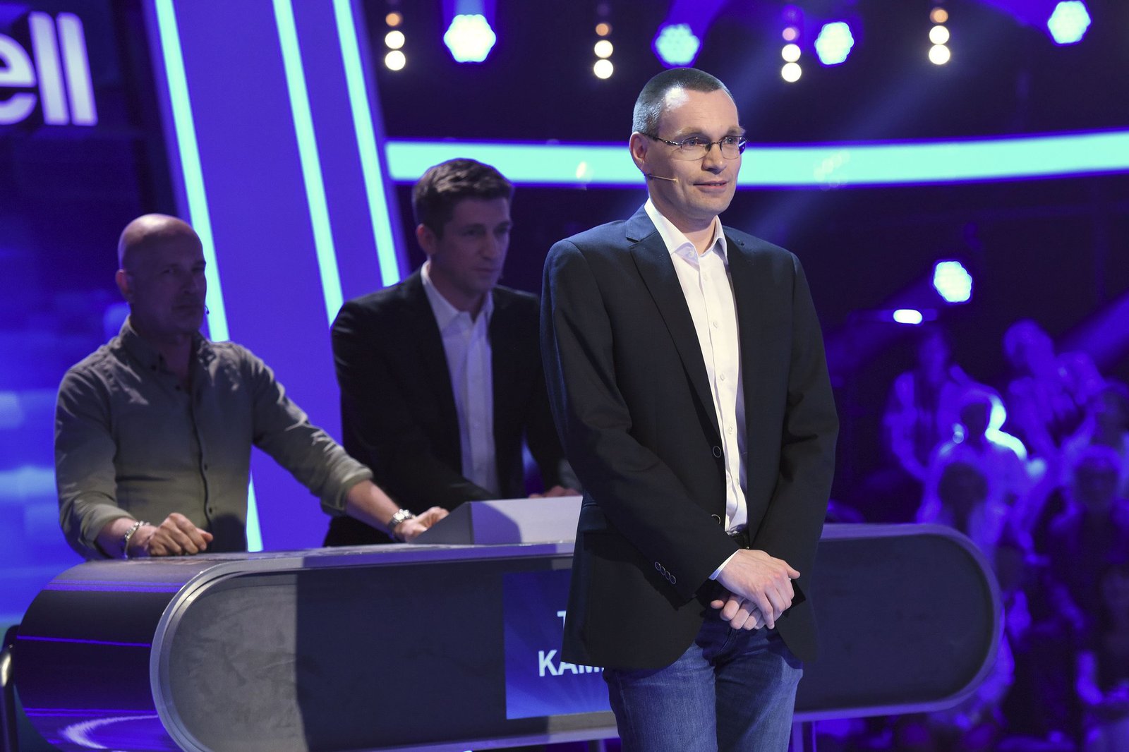 Olymp: Steffen Hallaschka & Christian BerkelQuizduell-Olympionik Thorsten Zirkel (r.) stellt sein Wissen gegen die Kandidaten des Teams "Kamera?: Schauspieler Christian Berkel (l.) und Moderator Steffen Hallaschka (M.) unter Beweis.Bild: © ARD/Uwe Ernst