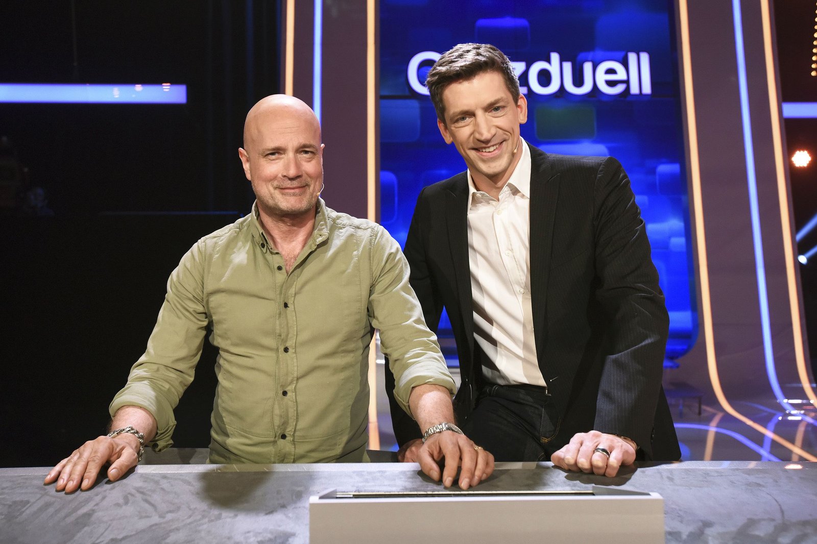 Olymp: Steffen Hallaschka & Christian BerkelDie Kandidaten des Teams "Kamera?: Schauspieler Christian Berkel (l.) und Moderator Steffen Hallaschka (r.), treten gegen die Quizduell-Olympioniken Annika Schewe, Prof. Eckhard Freise und Thorsten Zirkel an.Bild: © ARD/Uwe Ernst