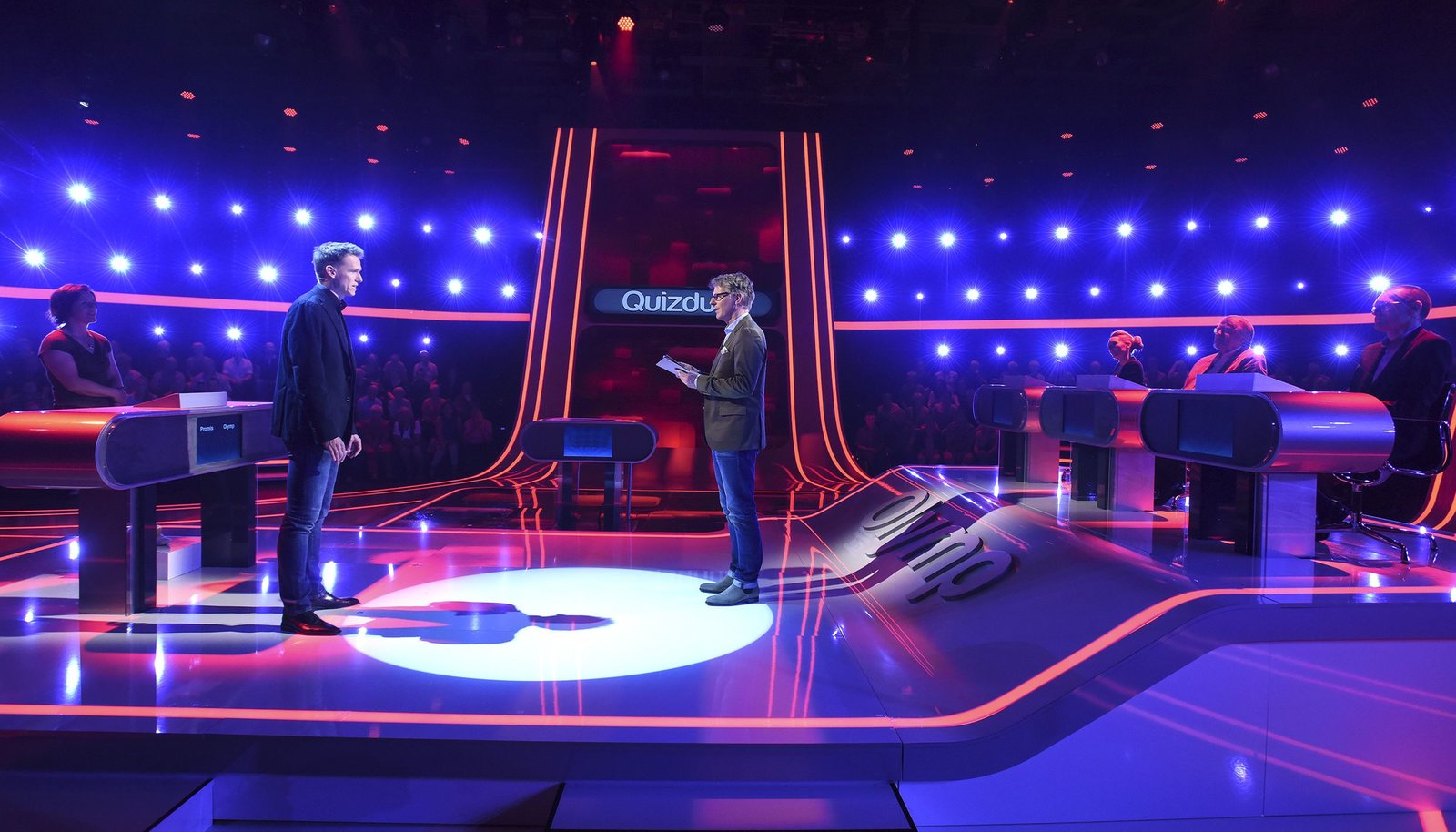 Olymp: Michael Groß & Franziska van AlmsickQuizduell-Olymp: Prominente gegen Deutschlands Quiz-Giganten. Die Olympioniken Annika Schewe (l.), Thorsten Zirkel (M.) und Michael Hartmann (l.) treten gegen Franziska van Almsick und Michael Groß an.Bild: © ARD/Lisa Krechting