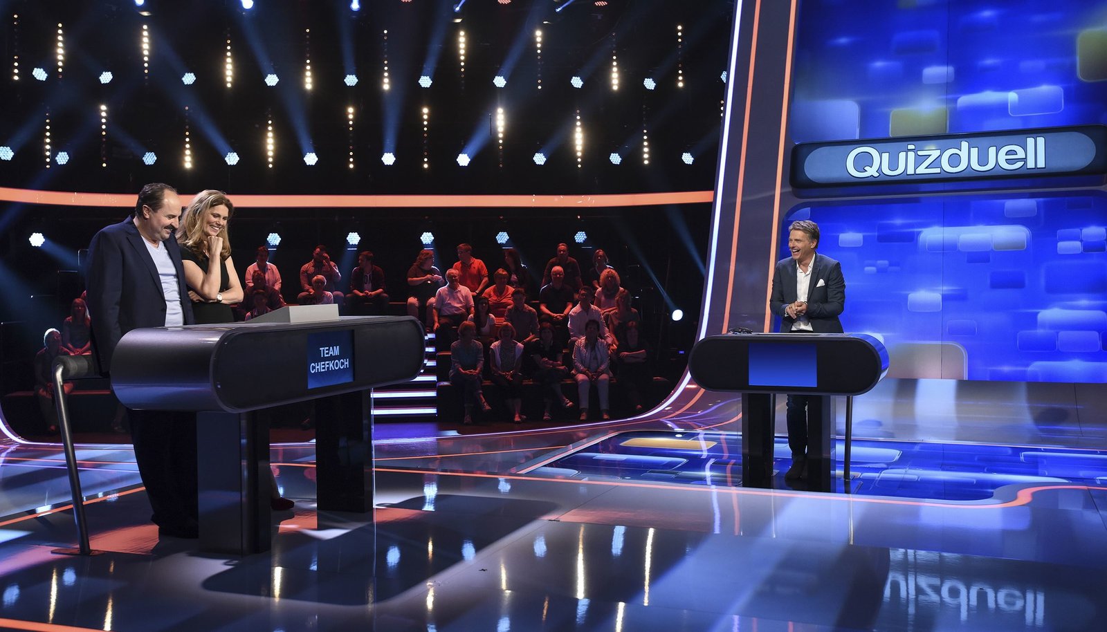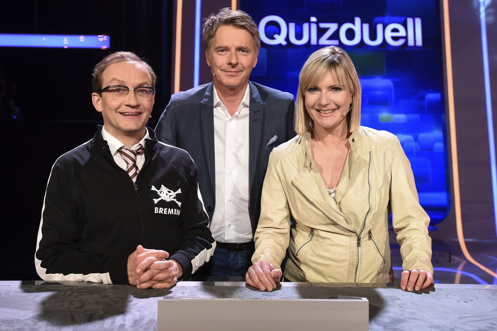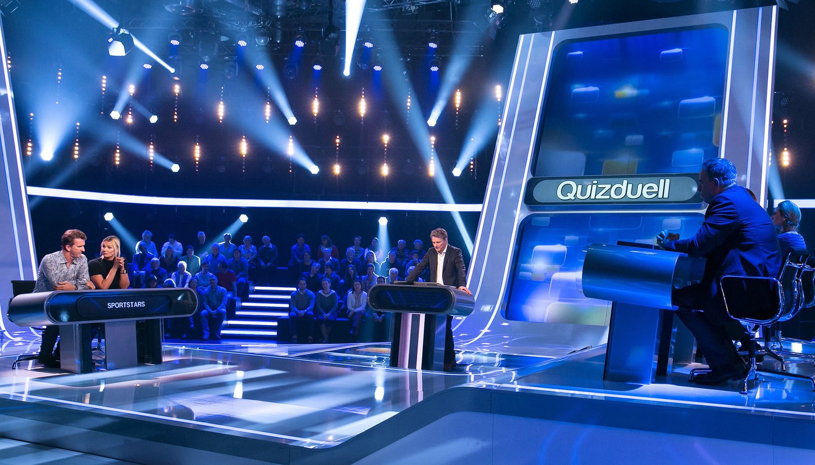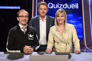 Olymp: Marcel Reif & Katrin Müller-HohensteinQuizduell-Olymp: Prominente gegen Deutschlands Quiz-Giganten. Jörg Pilawa (M.) und das Team "Sportmoderatoren":Gerhard Delling (l.) und Steffen Hallaschka (r.).Bild: © ARD/Markus Hertrich