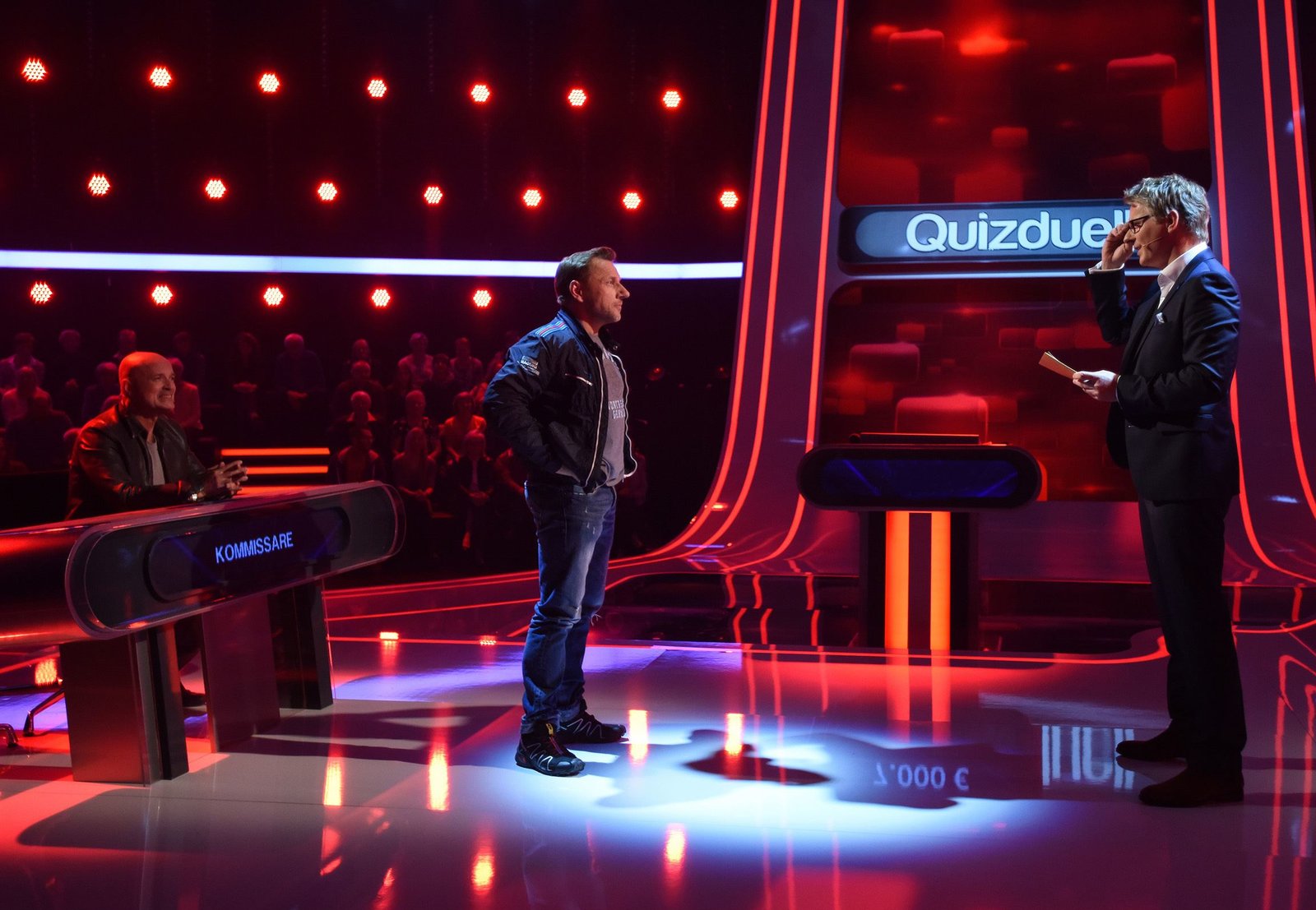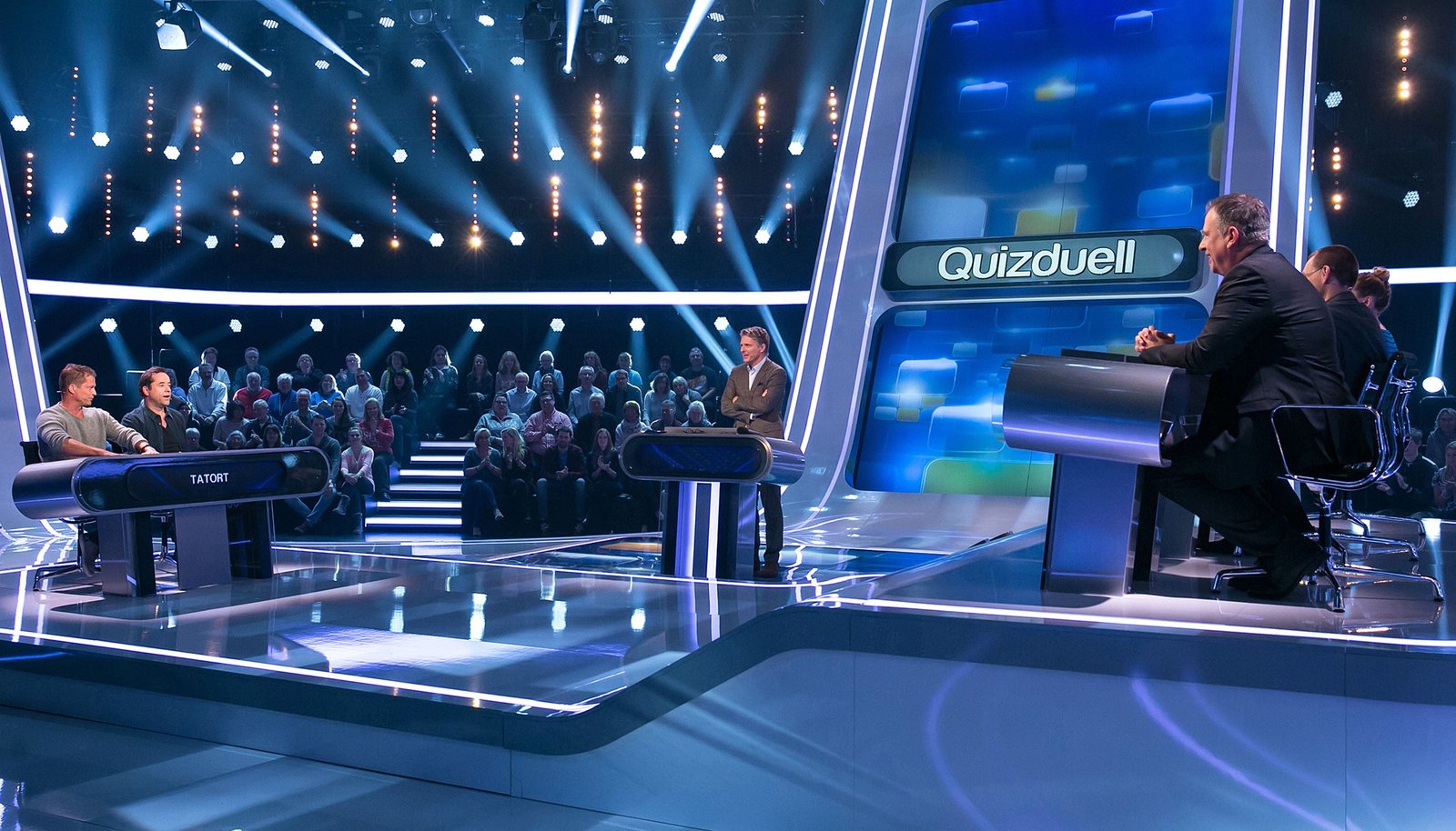 Olymp: Richy Müller & Christian BerkelQuizduell-Olymp: Prominente gegen Deutschlands Quiz-Giganten. Jörg Pilawa (r.) präsentiert das Team "Kommissare": Richy Müller (M) und Christian Berkel (l.).Bild: © ARD/Uwe Ernst