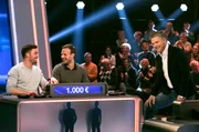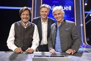 Olymp: Jörg Draeger & Frederic MeisnerModerator Jörg Pilawa (M.) mit den Kandidaten des Teams „Showstars“: Jörg Dräger (l.) und Frederic Meisner (r.), beide Moderatoren.Bild: © ARD/Uwe Ernst