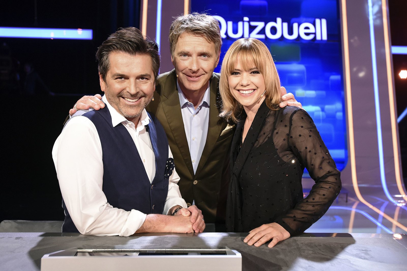 Olymp: Thomas Anders & Francine JordiBei Jörg Pilawa treten freitags um 18:50 Uhr Prominente zu einem außergewöhnlichen Duell an. Um zu gewinnen, müssen die Stars in sechs Runden drei superschlaue „Quizduell"-Profis schlagen. Ein Wissenswettkampf David gegen Goliath - die Stars gegen den „Quizduell-Olymp“. Es geht um Wissen und Nervenstärke, aber auch um die Einschätzung der Gegner und die Bereitschaft zu zocken. Und es geht um viel Geld. Doch Vorsicht! Im packenden Finale am Ende jeder Show heißt es für die siegreichen Kandidaten zunächst: doppelt oder halb. Eine spannende Wissensschlacht für Jung und Alt! Moderator Jörg Pilawa (M.) begrüßt seine Kandidaten: Thomas Anders (l.) und Franci Jordi (r.). Die beiden treten als Team „Musik“ gegen die Quizduell-Olympioniken Annika Schewe, Prof. Eckhard Freise und Thorsten Zirkel an.Bild: © ARD/Uwe Ernst