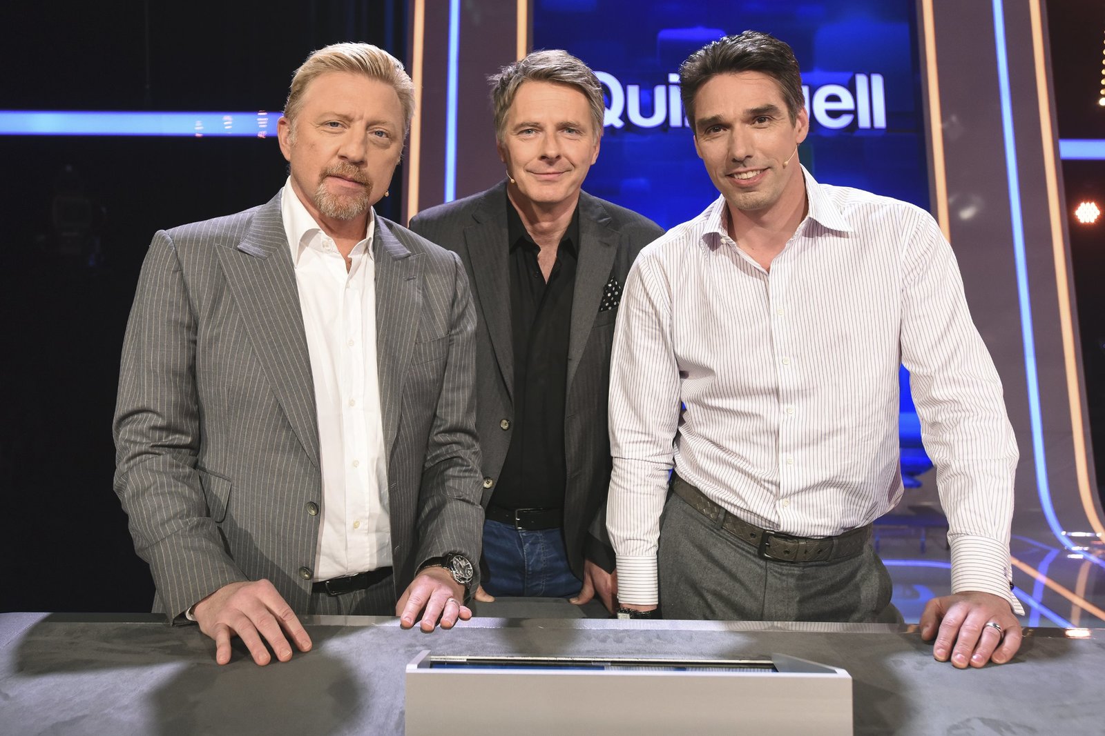 Olymp: Boris Becker & Michael StichModerator Jörg Pilawa (M.) begrüßt die Ex-Tennisprofis und Wimbledonsieger Boris Becker (l.) und Michael Stich (r.). Sie treten gegen die Quizduell-Olympioniken Annika Schewe, Prof. Eckhard Freise und Thorsten Zirkel an.Bild: © SWR/ARD/Uwe Ernst