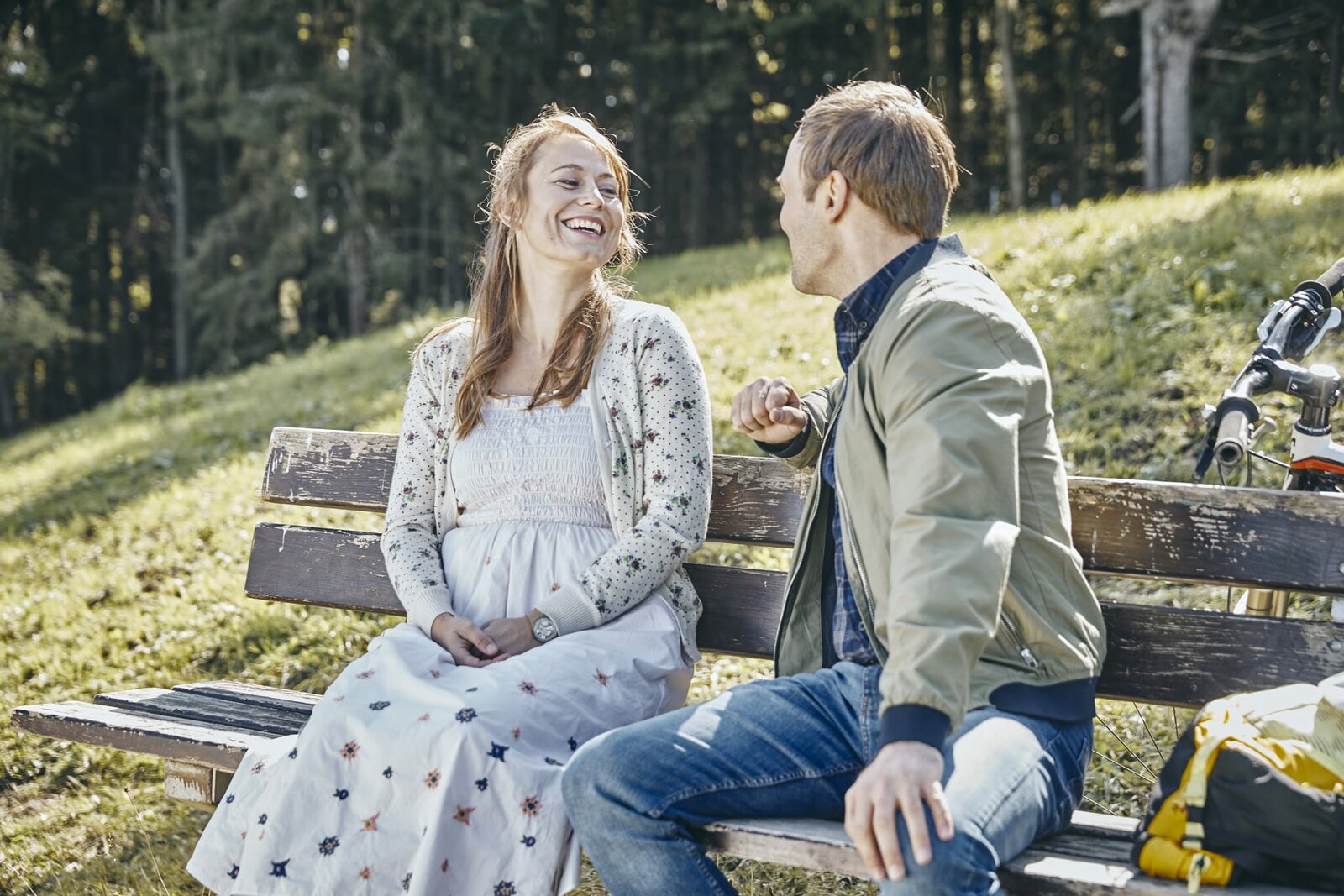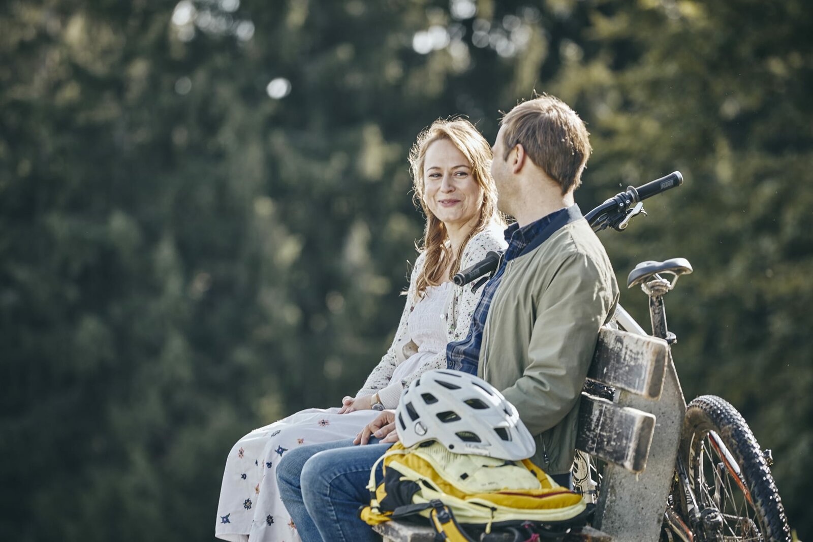 Eva (Ines Hollinger) und Martin (Andreas Tobias) auf dem Bankerl überm Wiesnerhof – sie sprechen über Flori.
