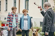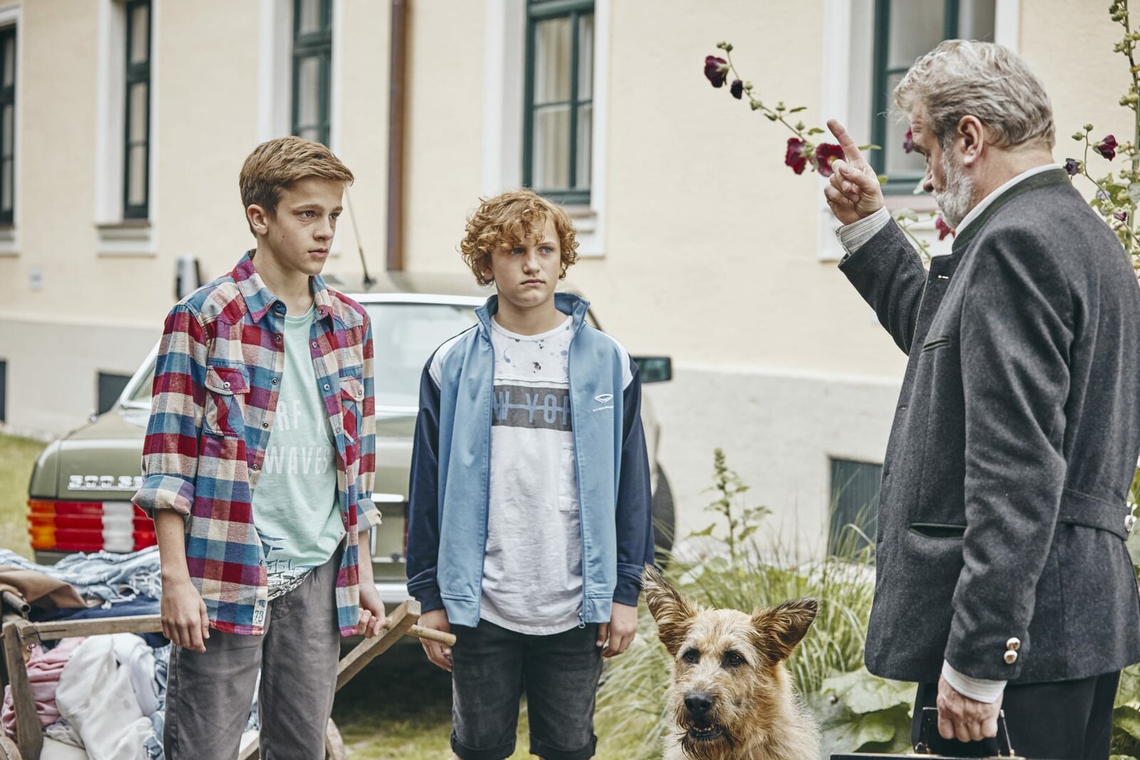 Flori (Leon und Lino de Greiff) und Sebastian (Niko Jungmann) bekommen eine Schelte vom Bürgermeister Huber (Titus Horst).