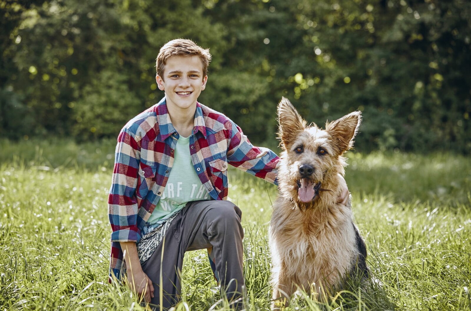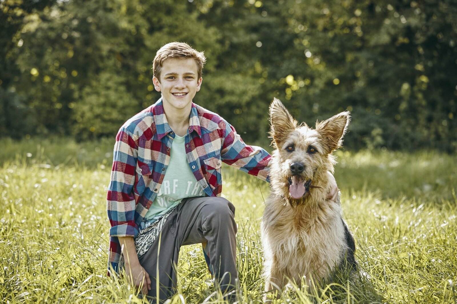 ARD/BR RACKO - EIN HUND FÜR ALLE FÄLLE Racko ist wieder los! Drehstart zu neuen Folgen für die zweite Staffel in Oberbayern. Am 21. Juli haben rund um das oberbayerische Miesbach die Dreharbeiten zu neuen Folgen der Familienserie „Racko – Ein Hund für alle Fälle“ (BR/ARD) begonnen. Dabei entstehen neun weitere Episoden der zweiten Staffel. Vier Folgen dafür wurden bereits 2019 abgedreht. Die ARD-Familienserie wird unter Federführung des Bayerischen Rundfunks vor oberbayerischer Alpenkulisse für Das Erste produziert. Ausgestrahlt wird die komplette zweite Staffel voraussichtlich im Frühjahr 2021. Im Bild: Flori (Leon de Greiff) mit seinem Racko (Filmhund Chewakka). © ARD/BR/Filmbuero Muenchner Feiheit/Zeno Legner, honorarfrei - Verwendung gemäß der AGB im engen inhaltlichen, redaktionellen Zusammenhang mit genannter ARD-Sendung und bei Nennung "Bild: ARD/BR/Filmbuero Muenchner Feiheit/Zeno Legner" (S2). ARD-Programmdirektion/Bildredaktion, Tel: 089/5900-4302, Fax: 089/550-1259, bildredaktion@DasErste.de