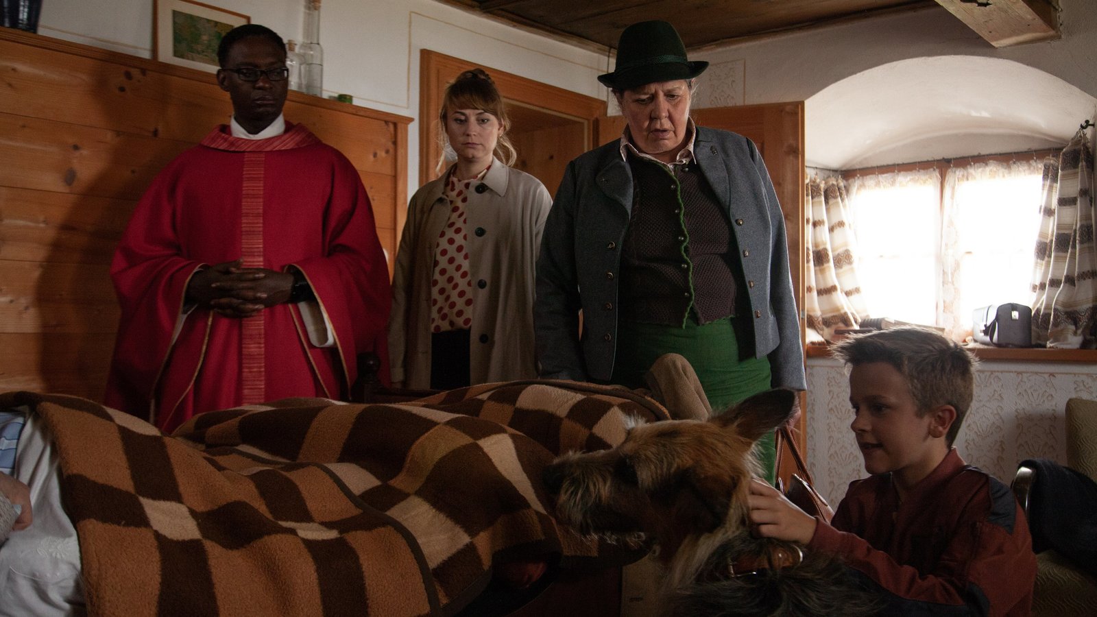Unerwarteter BesuchDie kleine Trauergemeinde (von links: David Wurawa, Ines Hollinger, Monika Manz) registriert erstaunt, dass Hofhund Racko Flori (Leon / Lino de Greiff, rechts) akzeptiert.Bild: © BR/Filmbüro Münchner Freiheit GmbH/Johannes Brugger