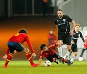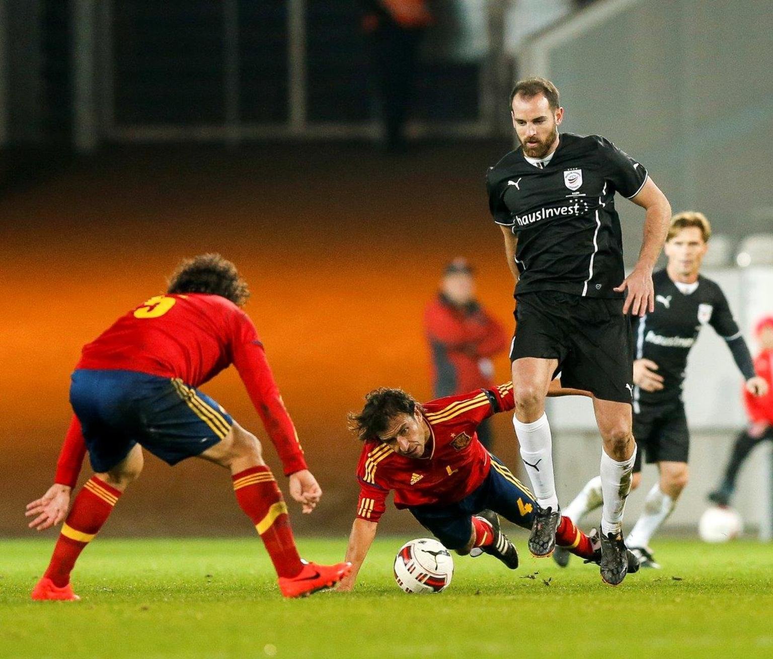 Hier treffen Fußball-Legenden aufeinander: die spanischen Spieler Iavan Campo (l.) und David Albelda (2.v.l.) gegen die deutschen Spieler Christoph Metzelder (2.v.r.) und Dariusz Wosz (r.) ...Bild: © Deutsche Fussball Legenden e.V. Lizenzbild frei
