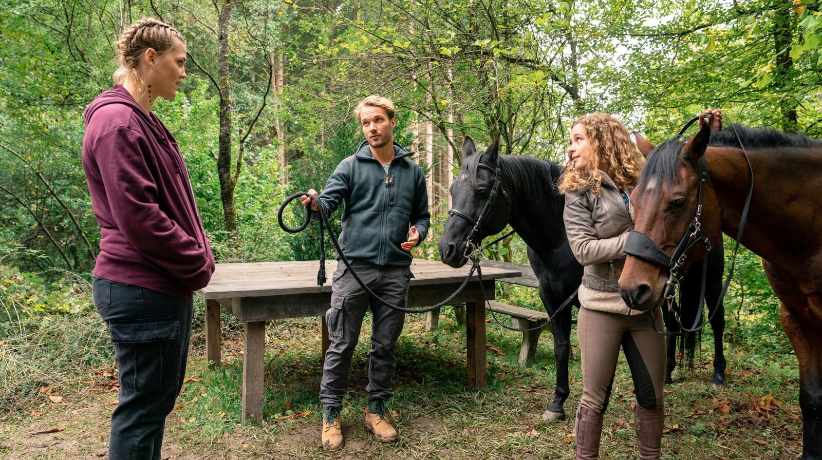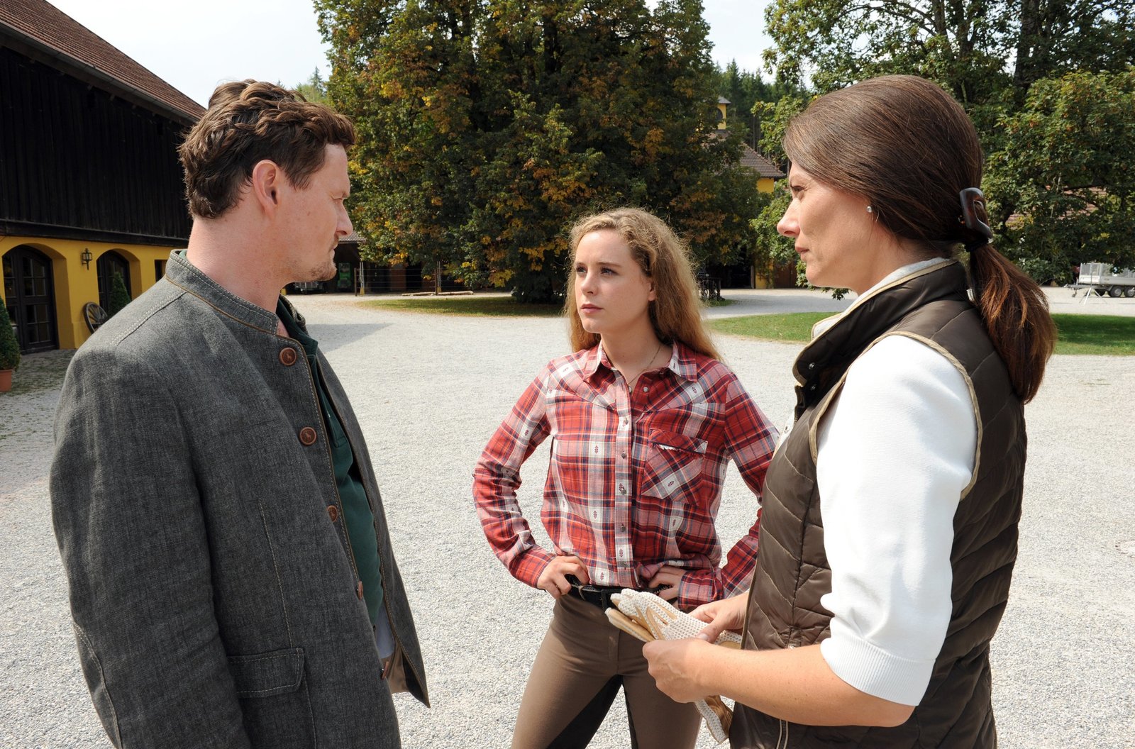 Der Junge und das PferdWas ist mit der Stute Luana los? Rike (Klara Deutschmann, re.) und Jan (Stefan Pohl) stellen Besitzerin Marika (Dorka Gryllus, li.) zur Rede.Bild: © ARD Degeto/Marc Reimann