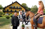 Die PferdeflüsterinRike (Klara Deutschmann, re.) reitet "Jacomo" und versucht die Investoren Hubertus Steckmann (Alexander E. Fennon, 2.v.re.) und Richard Muerer (Rolf Sarkis, li.) zu überzeugen. Ihre Mutter Elsa (Ulli Maier, 2.v.li.), ihr Bruder Ferdinand (Shenja Lacher) und Christian (Alexander Khuon, 3. v. li.) schauen zu.Bild: © ARD Degeto/Kerstin Stelter