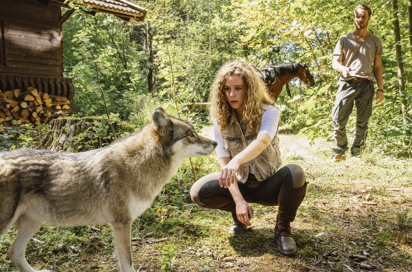 Jacomo und der WolfRike (Klara Deutschmann) begegnet dem Wolf. Moritz (Max Woelky) gibt ihr Verhaltenstipps.Bild: © ARD Degeto/Hendrik Heiden