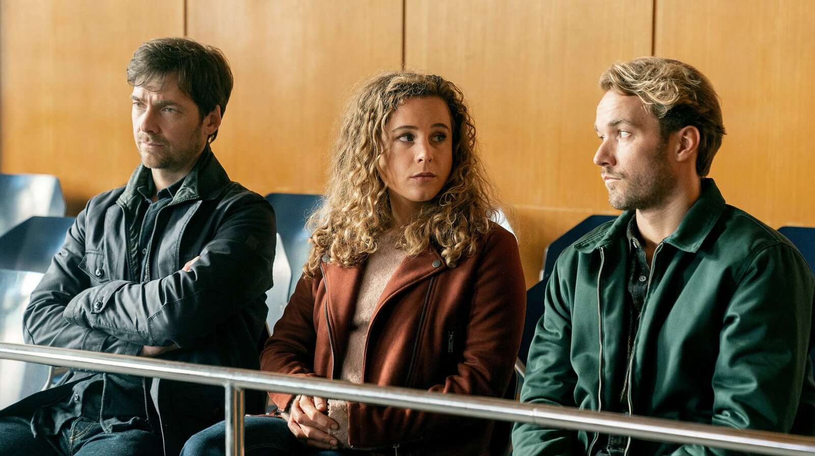 Sprung ins LebenRike Wildenstein (Klara Deutschmann) sitzt „buchstäblich“ zwischen Jan (Stefan Pohl) und Moritz (Max Woelky, re.).Bild: © ARD Degeto/Marc Reimann