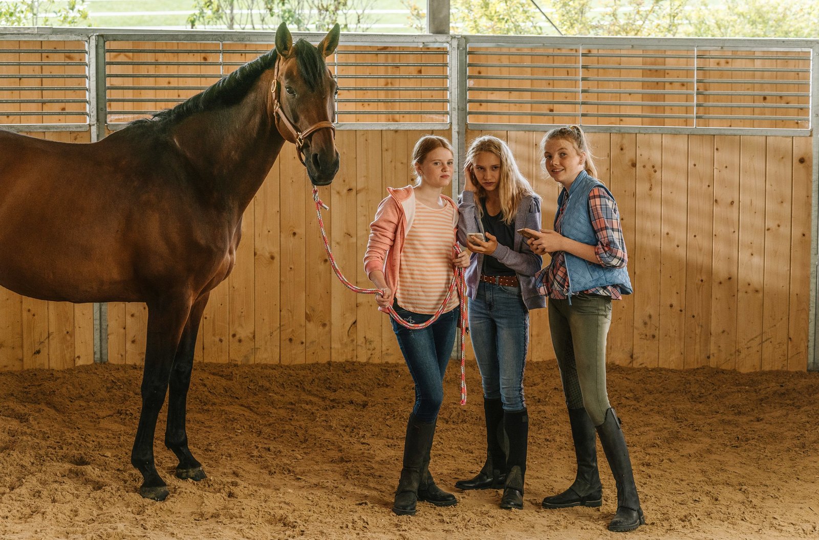 Kampf um JacomoReiterhof Wildenstein - Kampf um Jacomo Stefan Pohl als Jan Meier, Delphine Lohmann als Anabel Falkenberg, Nele Trebs als Tabea, Klara Deutschmann als Rike Wildenstein SRF/ARD Degeto/Neue Bioskop/Hendrik HeidenBild: © SRF1