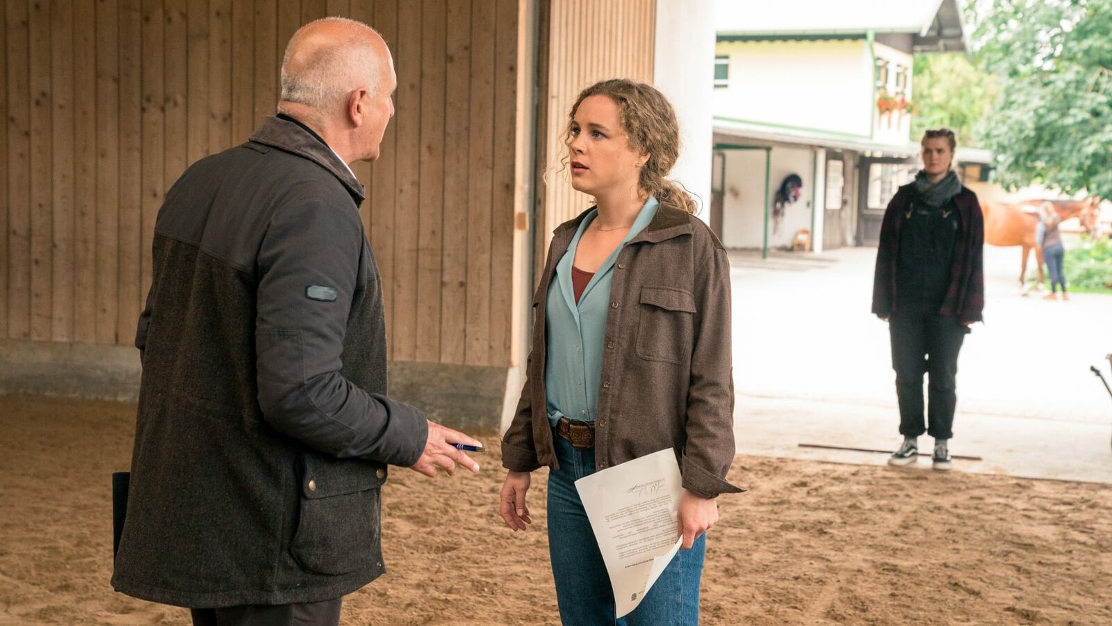 Kampf um JacomoPolizeichef Jan Meier (Stefan Pohl) zwingt Rike (Klara Deutschmann, re.), die vorbestrafte Tabea (Nele Trebs) auf dem Reiterhof aufzunehmen.Bild: © ORF 2