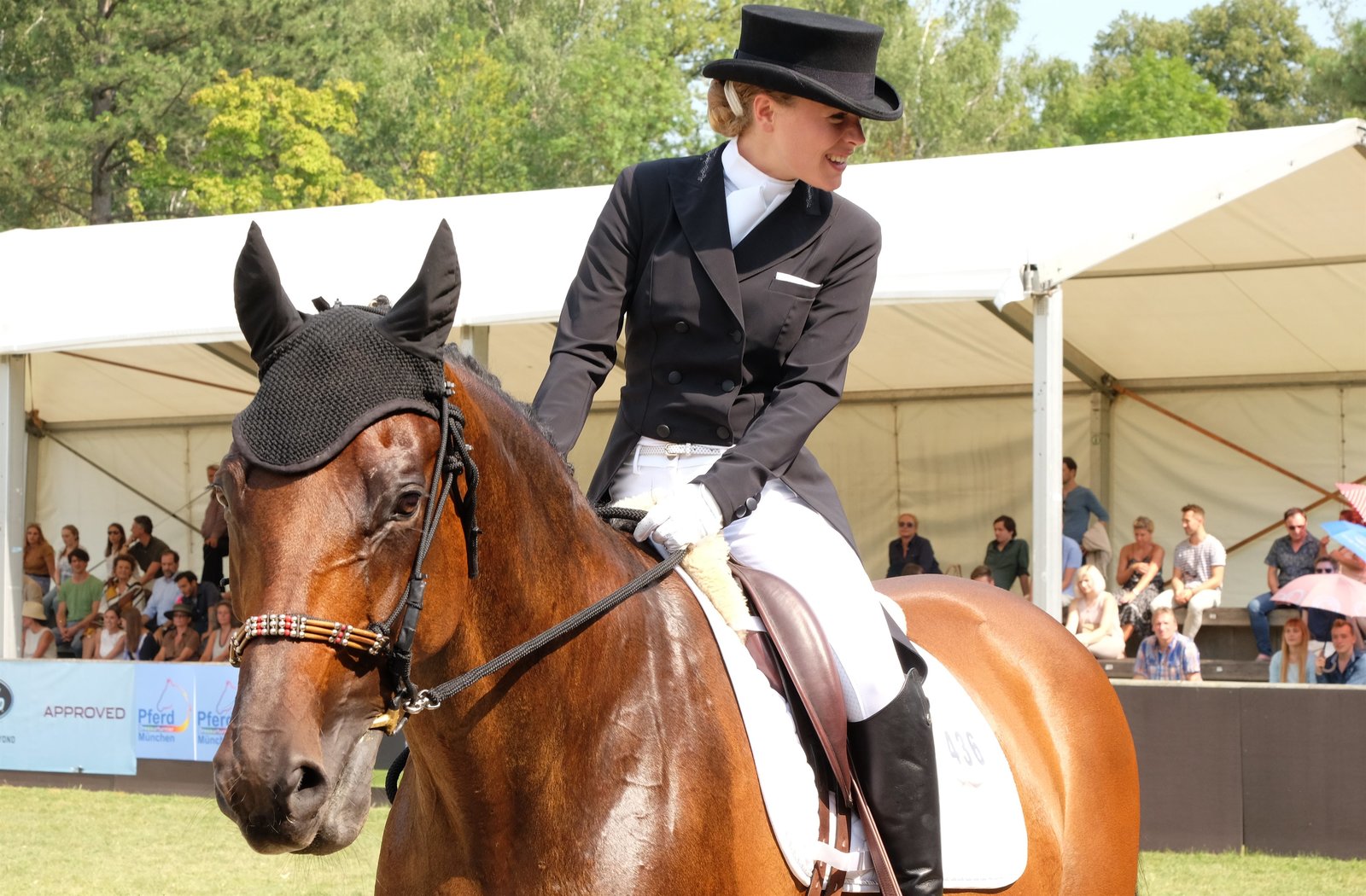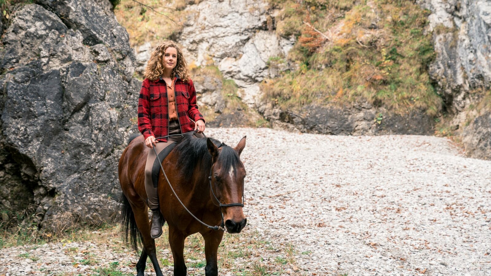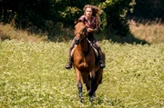 Die PferdeflüsterinTitelmotiv/Presseheft Rike Wildenstein (Klara Deutschmann) reitet auf dem Dressurpferd "Jacomo".Bild: © ARD Degeto/Hendrik Heiden