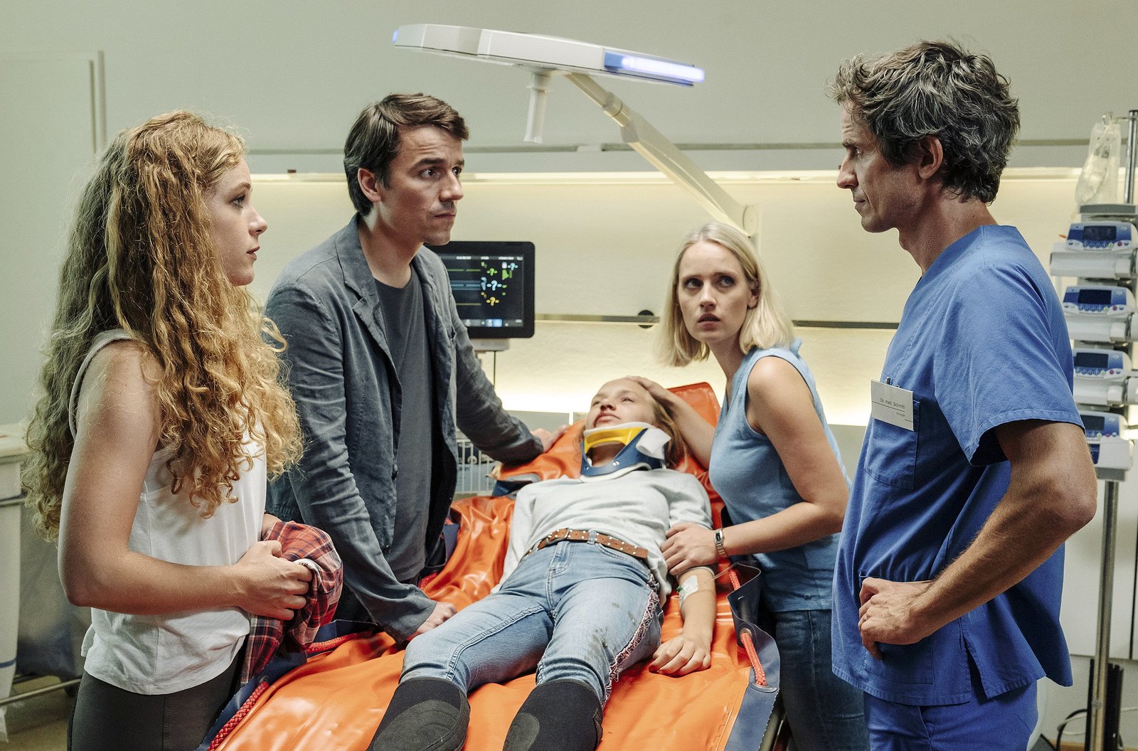 Kampf um JacomoGlück im Unglück: Christian (Alexander Khuon), seine Frau Jessica (Claudia Helene Hinterecker) und Rike (Klara Deutschmann, li.) erfahren von dem Arzt, dass Anabel (Mia/Delphine Lohmann) wieder gesund wird.Bild: © ARD Degeto/Hendrik Heiden
