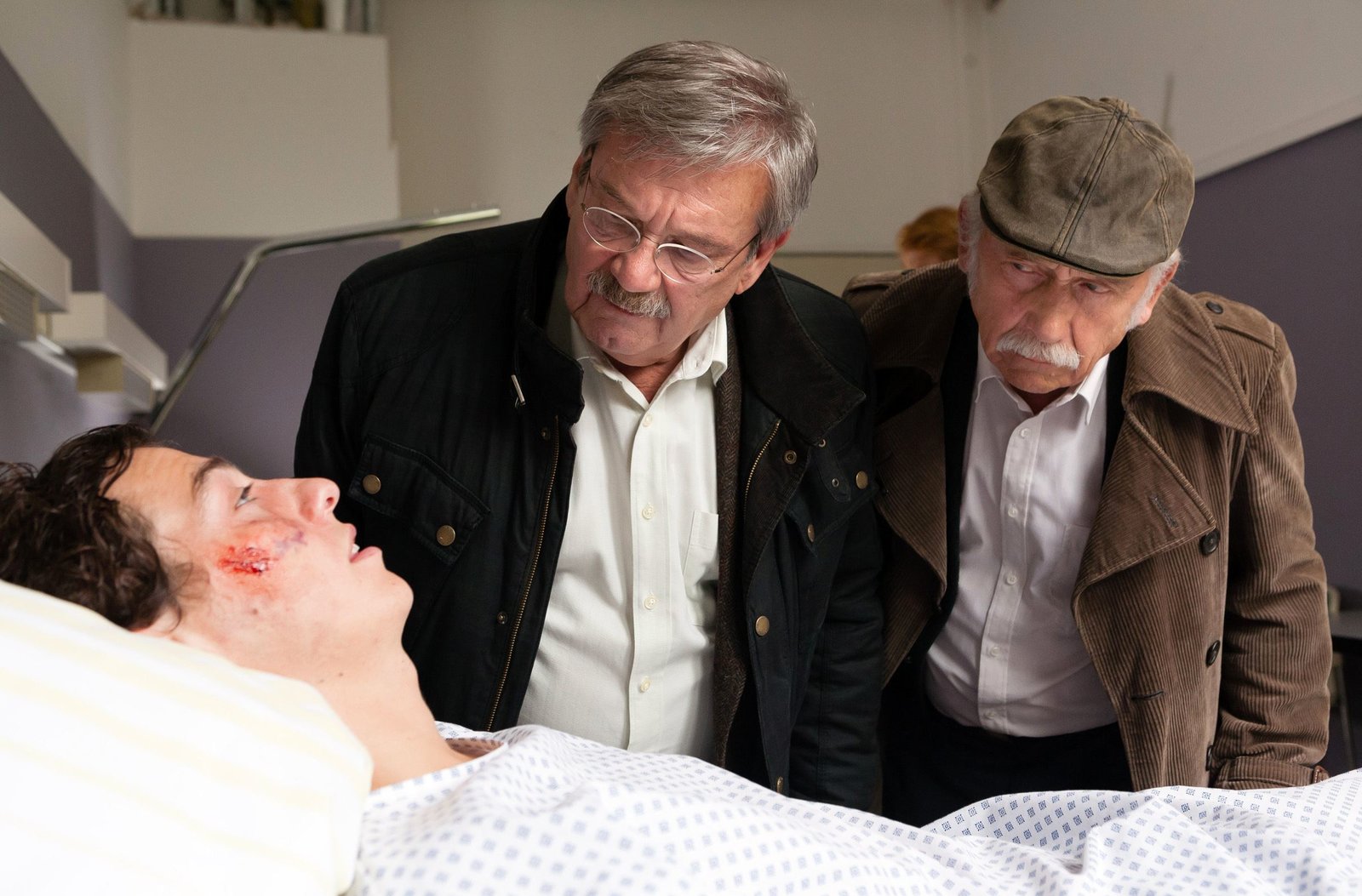Das WürfelspielGordon Gremberg (Nikolai Mohr, l.) liegt nach seinem Sprung von der Mühlheimer Brücke völlig derangiert auf der Intensivstation. Günter (Wolfgang Winkler, M.) und Edwin (Tilo Prückner, r.) müssen erkennen, dass ein Verhör des drogenbenebelten Patienten unmöglich ist.Bild: © ARD/Kai Schulz