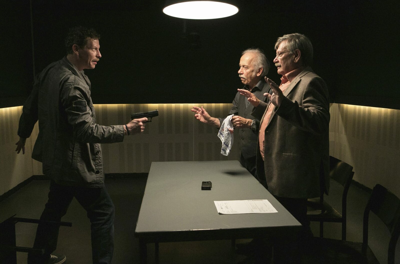 LiebesspielerWährend des Verhörs gelingt es dem Bankräuber Lutz Michel (Gerdy Zint, l.), Edwin (Tilo Prückner, 2.v.r.) und Günter (Wolfgang Winkler, r.), in der Wache als Geiseln zu nehmen.Bild: © NDR/ARD/Kai Schulz