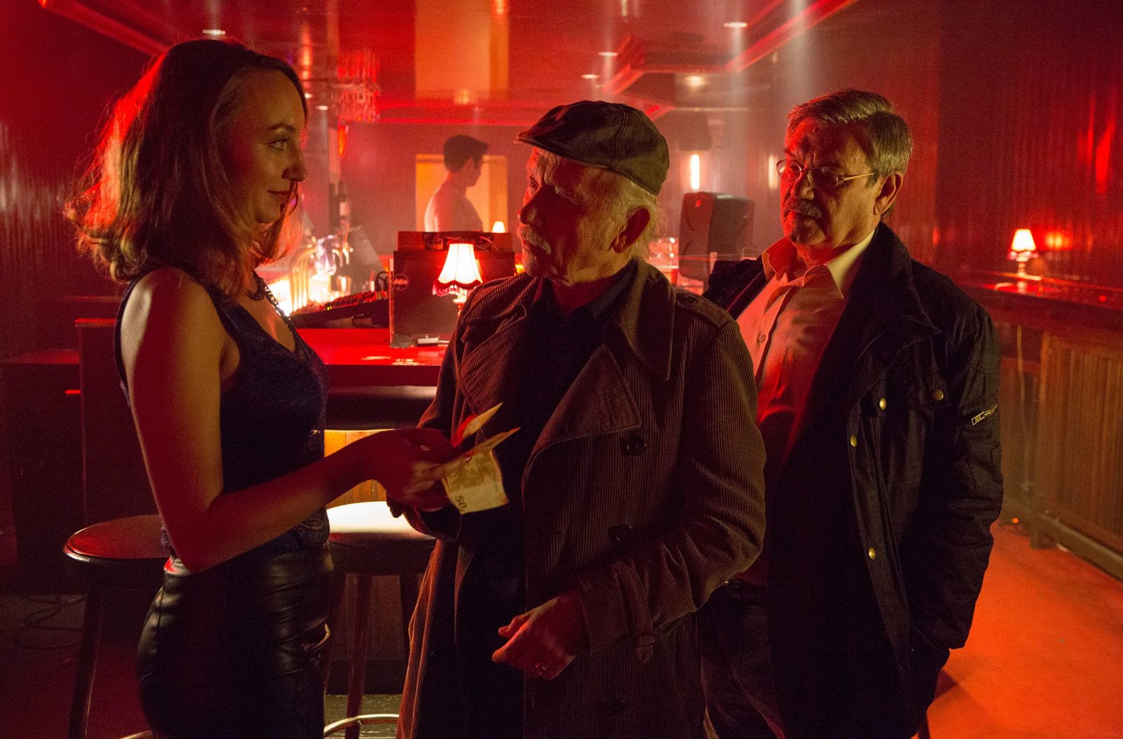 Das WürfelspielARD PROGRAMMDIREKTION, RENTNERCOPS, neue Vorabendserie (8 Folgen), Folge 4 "Das Würfelspiel", am Dienstag (21.04.15) um 18.50 Uhr im Ersten. Günter (Wolfgang Winkler, M.) und Edwin (Tilo Prückner, r.) wollen undercover im Club ermitteln. Doch sie kommen erst an Türsteher New Ulcus (Jasin Challah, l.) vorbei, als sie die Polizeimarke zücken.Bild: © ARD/Kai Schulz