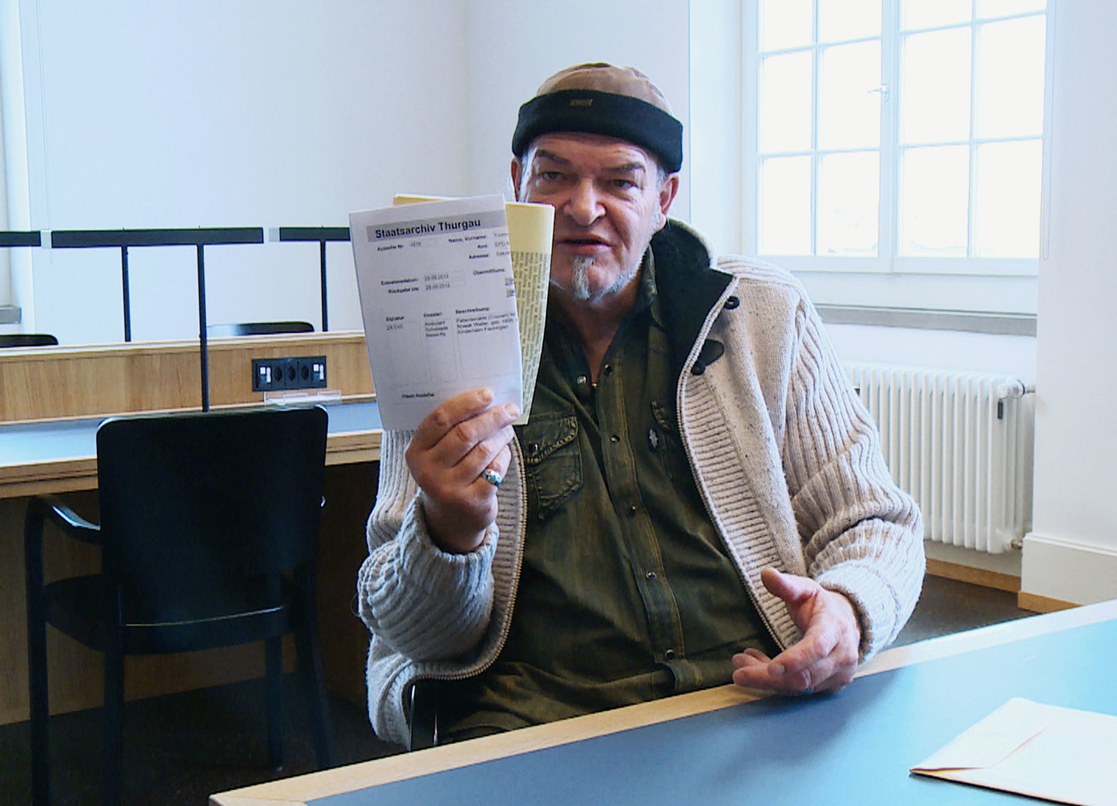 Walter Nowak im Staatsarchiv Thurgau mit Akten zu seiner Zeit in der PsychiatrieBild: © Copyright SRF