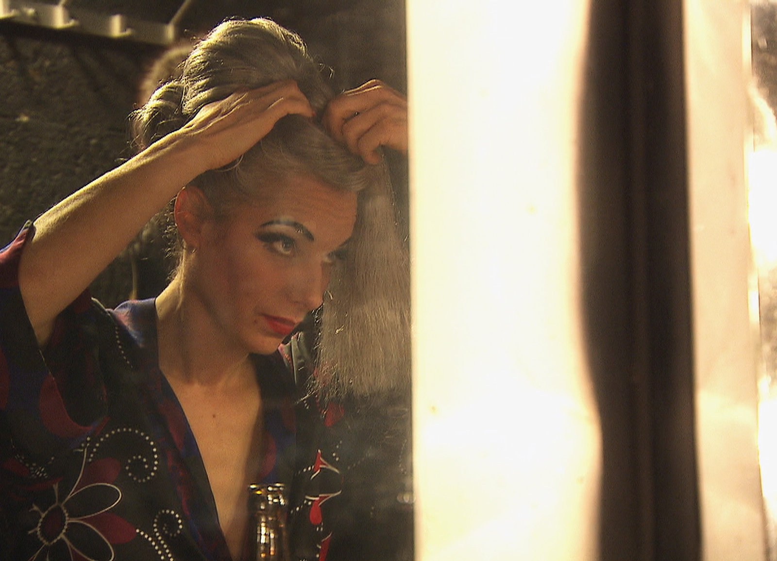 Koko zieht sich aus - Die Burlesque-Tänzerin Koko La Douce verführt mit Strapsen und HumorKoko La Douce macht sich Backstage für ihre Show bereitBild: © SRF
