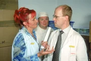 Gisis PuppeRita (Gaby Köster) weiht Schumann (Lutz Herkenrath, r.) und Bernie (Georg Alfred Wittner) in ihren Plan ein, wie sie verhindern können, dass Gisi einen Nervenzusammenbruch erleidet: kein Wort über Puppen und Sexspielzeug...Bild: © RTL