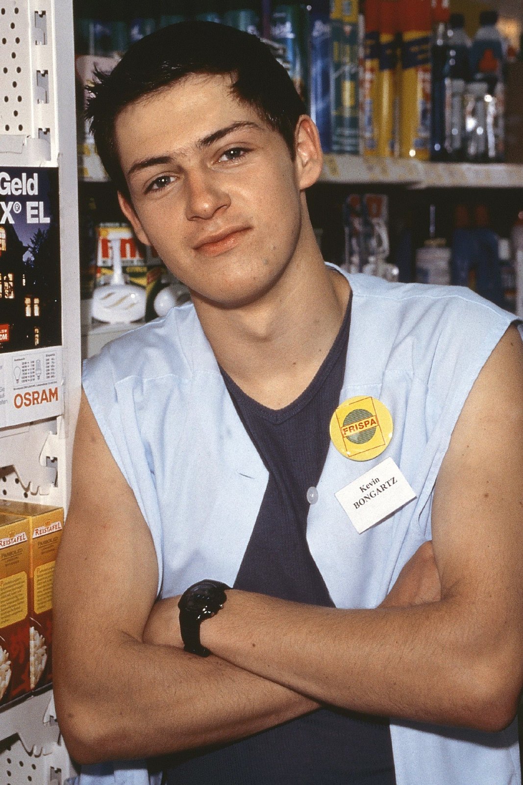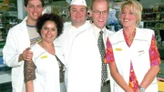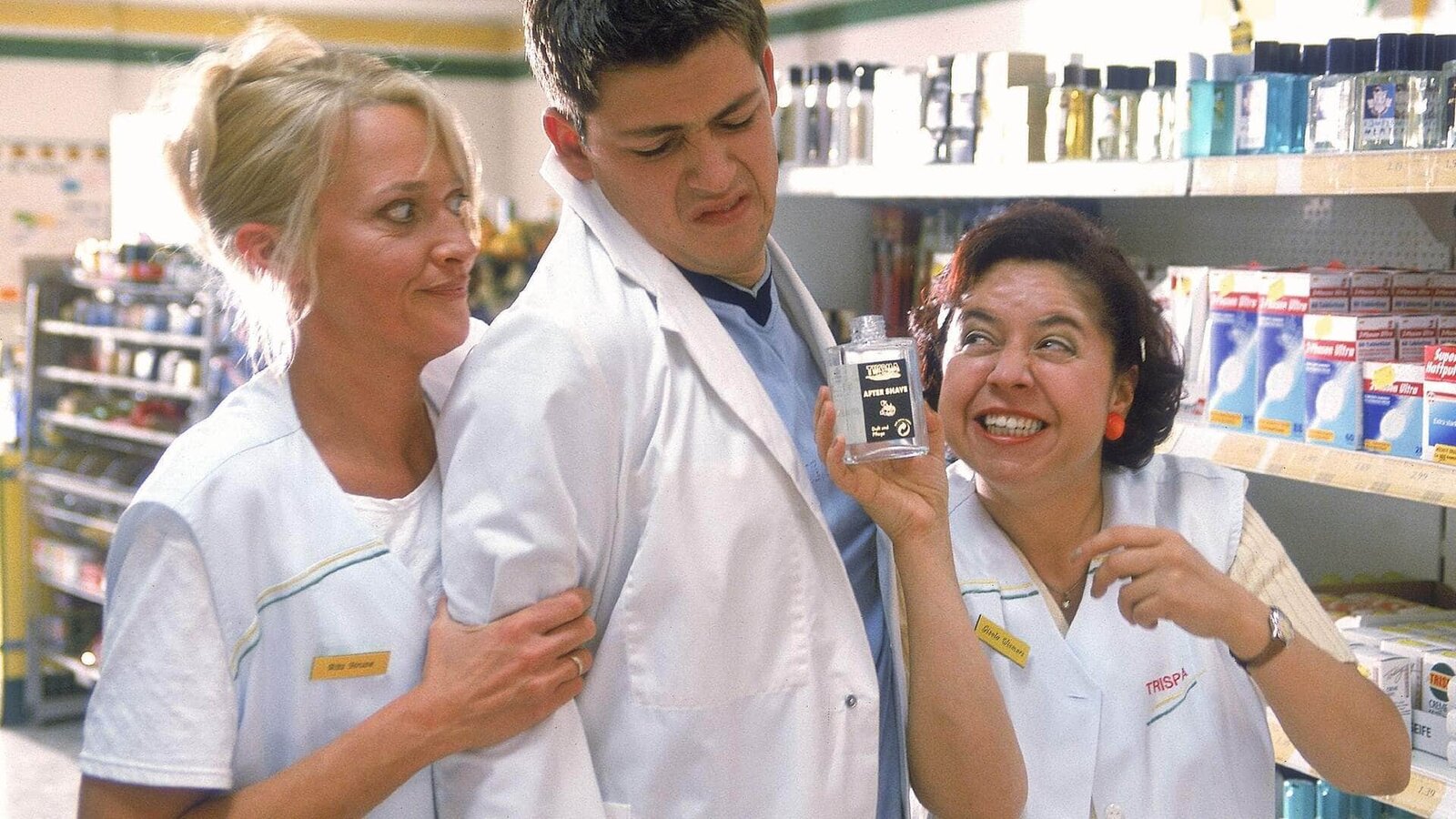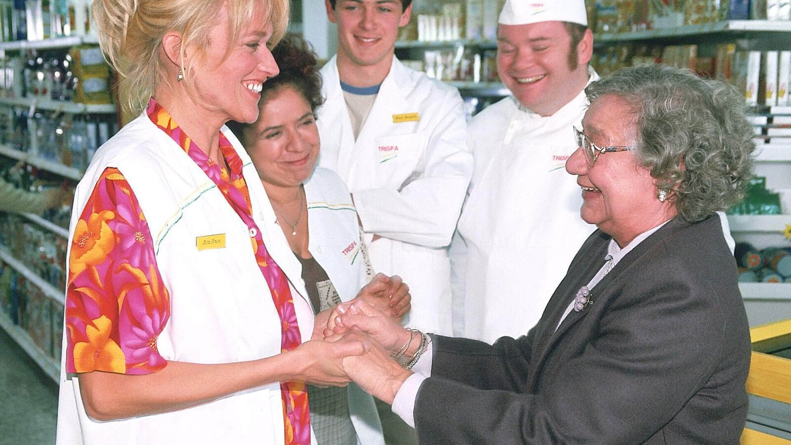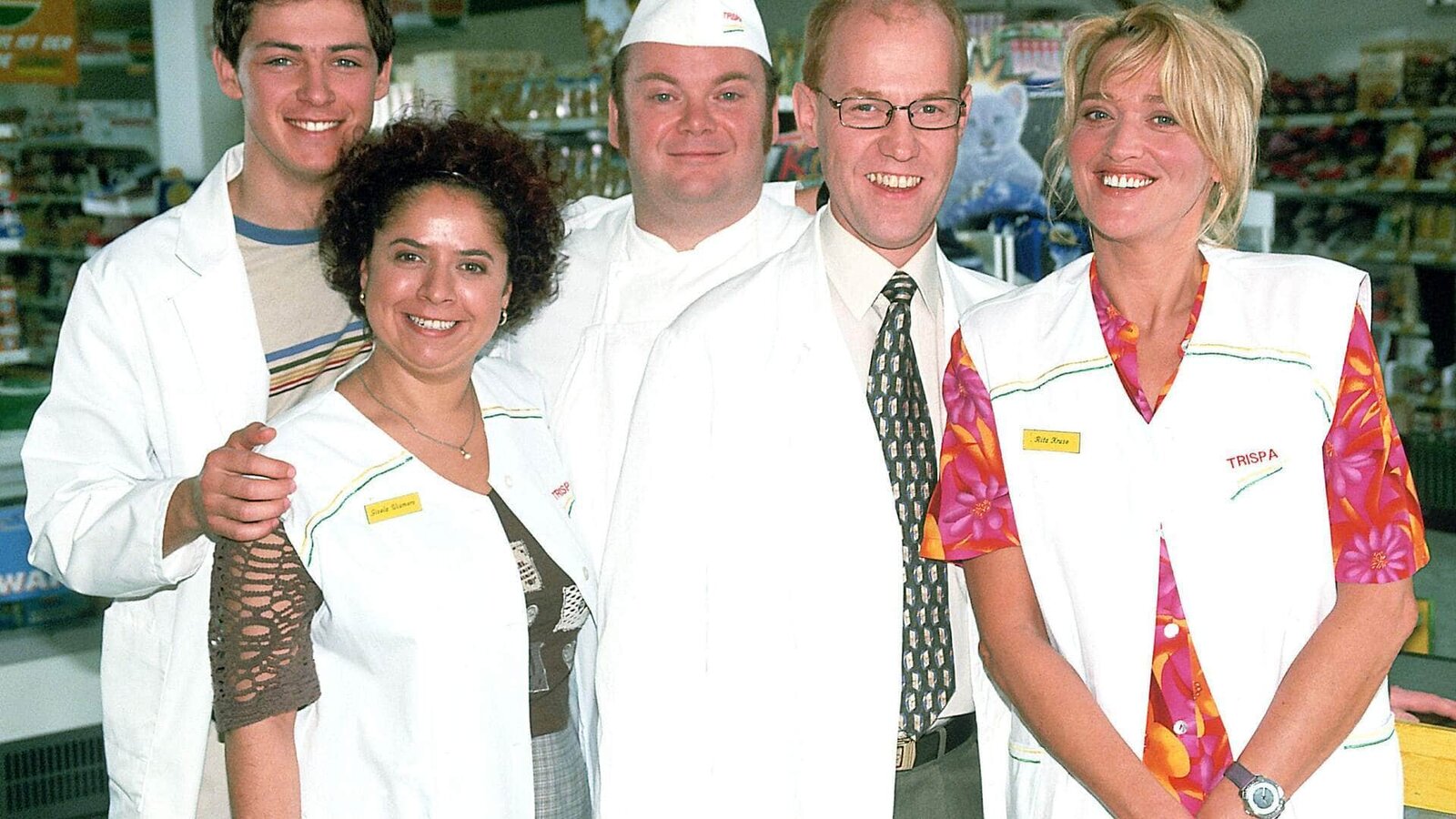 Ein Freund der Familie2. Staffel: Die 'Trispa'-Supermarkt-Crew, v.li.: Kevin Bongartz (Kevin Lorenz), Gisi Wiemers (Franziska Traub), Bernie Stemmer (Georg Alfred Wittner), Achim Schumann (Lutz Herkenrath), Rita Kruse (Gaby Köster)Bild: © TVNOW / Guido Engels