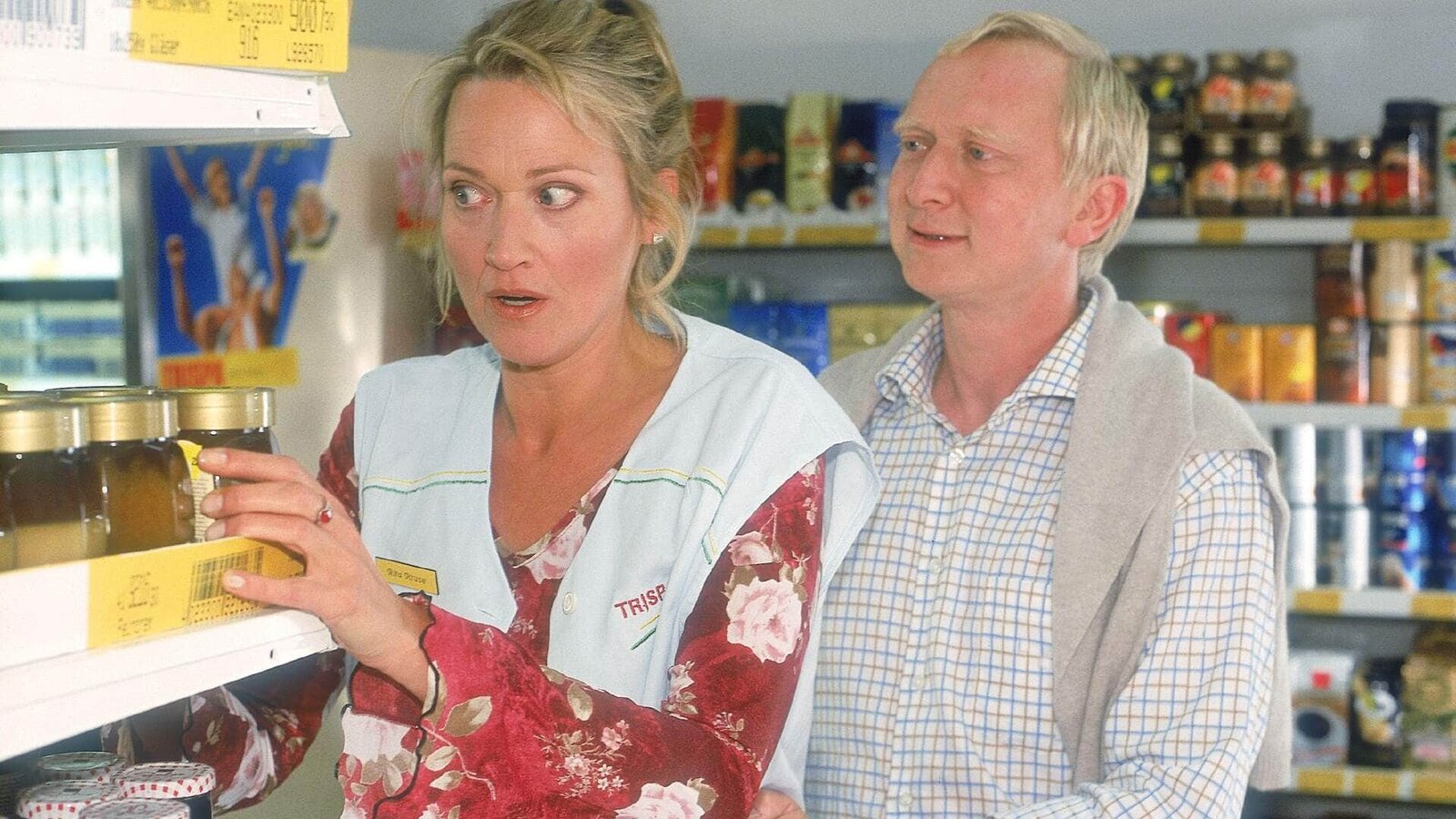 Freitag, der 13.Zwei Angsthasen im Supermarkt: Schumann (Lutz Herkenrath) und Rita (Gaby Köster) haben ein Geräusch gehört. Hätte Rita doch auf die Wahrsagerin gehört und wäre zu Hause geblieben!Bild: © RTLplus