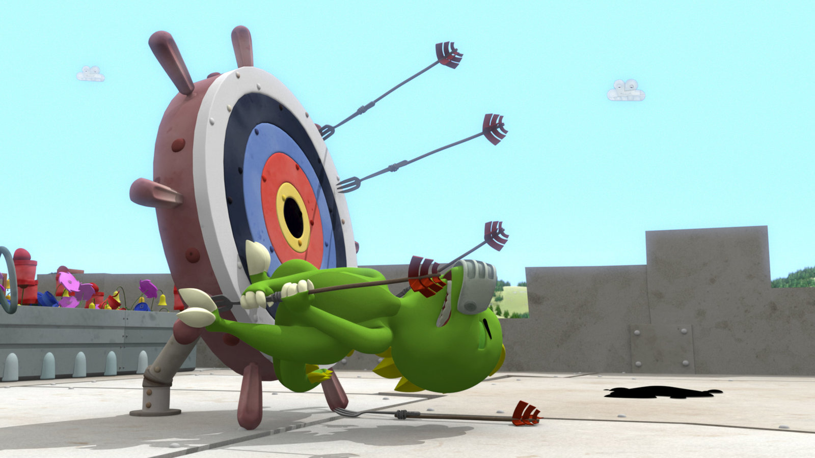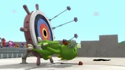 Rösti quietschtKoks hat doch ziemliche Probleme, die Pfeile aus der Schießscheibe herauszubekommen.Bild: © ZDF und Caligari