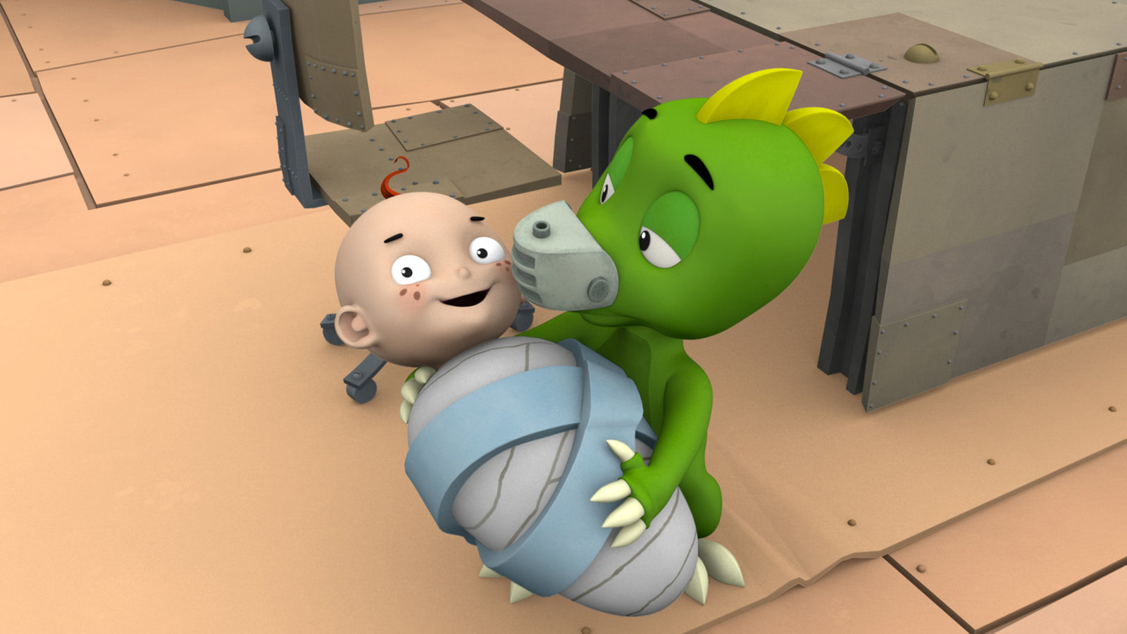 Der BabysitterDrache Koks hat die Aufsicht über ein Baby übernommen - und beide verstehen sich prima.Bild: © ZDF und Caligari
