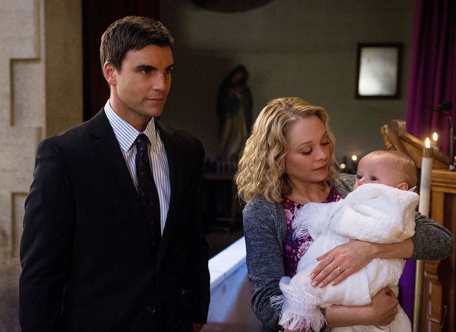 Mord in der KircheBei der Taufe seines Sohnes T.J. (Darsteller unbekannt) erfährt Tommy Rizzoli (Colin Egglesfield, l.) von der Kindsmutter Lydia (Alexandra Holden), dass sie plant mit den Baby nach Texas zu ziehen.Bild: © VOX