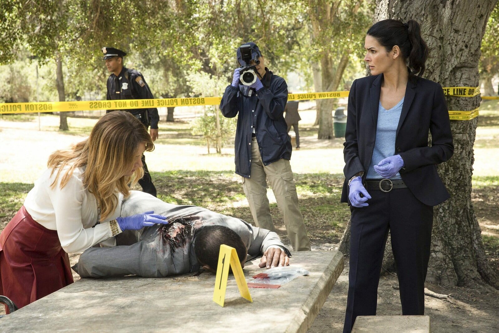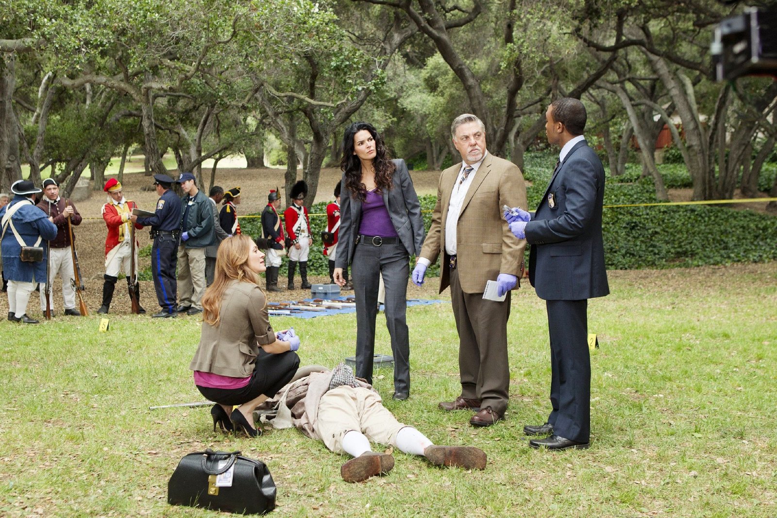 Der HeckenschützeWährend einer Aufführung bei den 'Liberty Days' wird ein Soldatendarsteller plötzlich von echter Munition getroffen. V.l.: Maura Isles (Sasha Alexander), Jane Rizzoli (Angie Harmon), (Korsak (Bruce McGill) und Detective Frost (Lee Thompson Youn) untersuchen die Leiche (Darsteller nicht zu ermitteln, 2.v.l.).Bild: © TVNOW / Warner Bros
