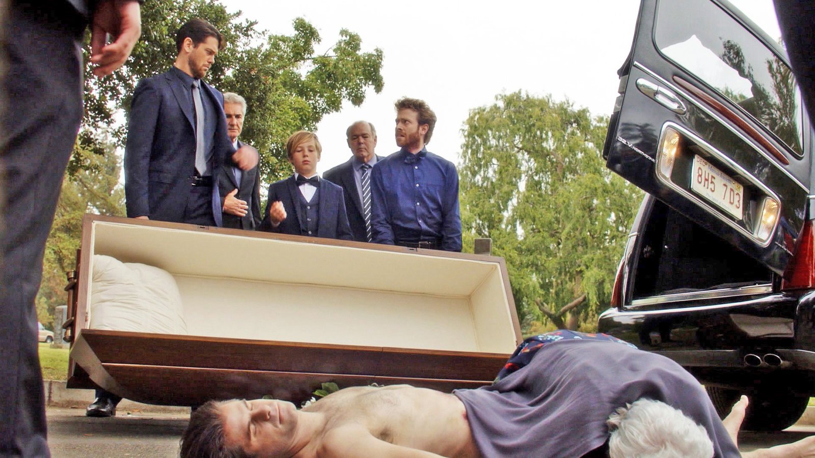 Ein Sarg für zweiIn dem Sarg einer alten Dame wird die unbekleidete Leiche ihres Bestatters entdeckt...Bild: © MG RTL D / Warner Bros